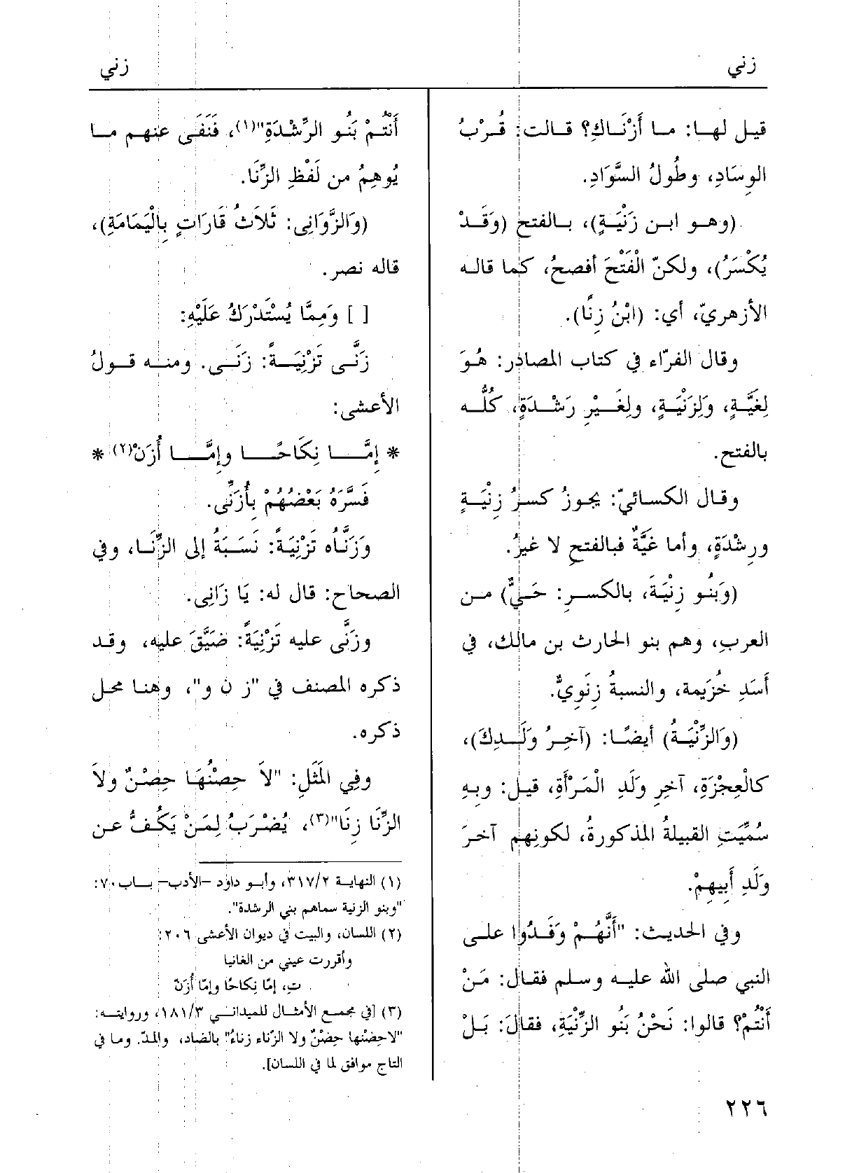 (وبُنو} زِنْيَةٍ، بالكسْرِ: حَيٌّ) مِنَ العَرَبِ، وهُم بنُو الحارِثِ بنِ مالِكٍ فِي أَسَدِ خزيمَةَ؛ والنَّسْبَةُ {زَنَوِيٌّ.