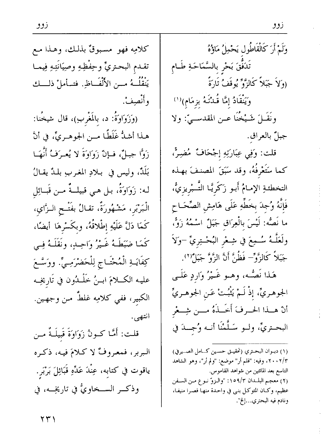 قُلْتُ: وَفِي عِبارَتِه إجْحافٌ مُضرُّ كَمَا سَتَعْرفُه. وَقد سَبَقَ المصنِّفَ بِهَذِهِ التَّخْطِئة الإمامُ أَبُو زكريَّا التَّبْرِيزِي، فإنَّه وجدَ بخطِّه على هامِشِ الصِّحاحِ مَا نَصّه: ليسَ بالعِراقِ جَبَلٌ اسْمُه} زَوٌّ، ولعلَّه سَمِعَ فِي شِعْرِ البُحْتُري: وَلَا جَبَلاً كالزَّوِّ، فظنَّ أنَّ الزَّوَّ جَبَلٌ؛ هَذَا نَصّه وَهُوَ غَيْرُ وارِدٍ على الجوهرِيّ إِذْ لم يَثْبَت عَن الجوهرِيّ أنَّ هَذَا الحرْفَ أَخَذَه مِن شِعْر البُحْتُري، وَلَو سلَّمنا أنَّه وجد فِي كَلامِه فَهُوَ مَسْبوقٌ بذلِكَ، وَهَذَا مَعَ تقدُّمِ البُحْتُري وحفْظِه وصِيانَتِه فيمَا يَنْقلُه مِنَ الألْفاظِ، فتأَمَّل ذلكَ وأَنْصِف.