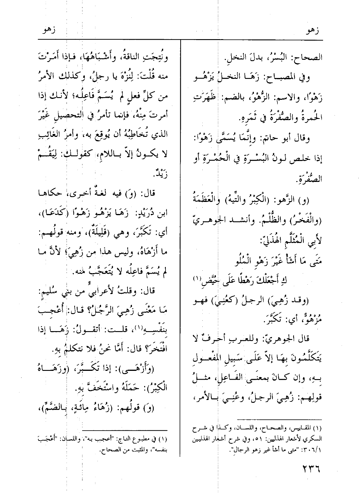 قالَ: وقُلْتُ لأعْرابيِّ مِن بَني سُلَيْم مَا مَعْنى} زُهِيَ الرَّجُلُ؟ قالَ: أُعْجِبَ بِهِ، قُلْتُ: أَتَقولُ زَها إِذا افْتَخَرَ؟ قالَ: أَمَّا نحنُ فَلَا نتكلَّمُ بِهِ.