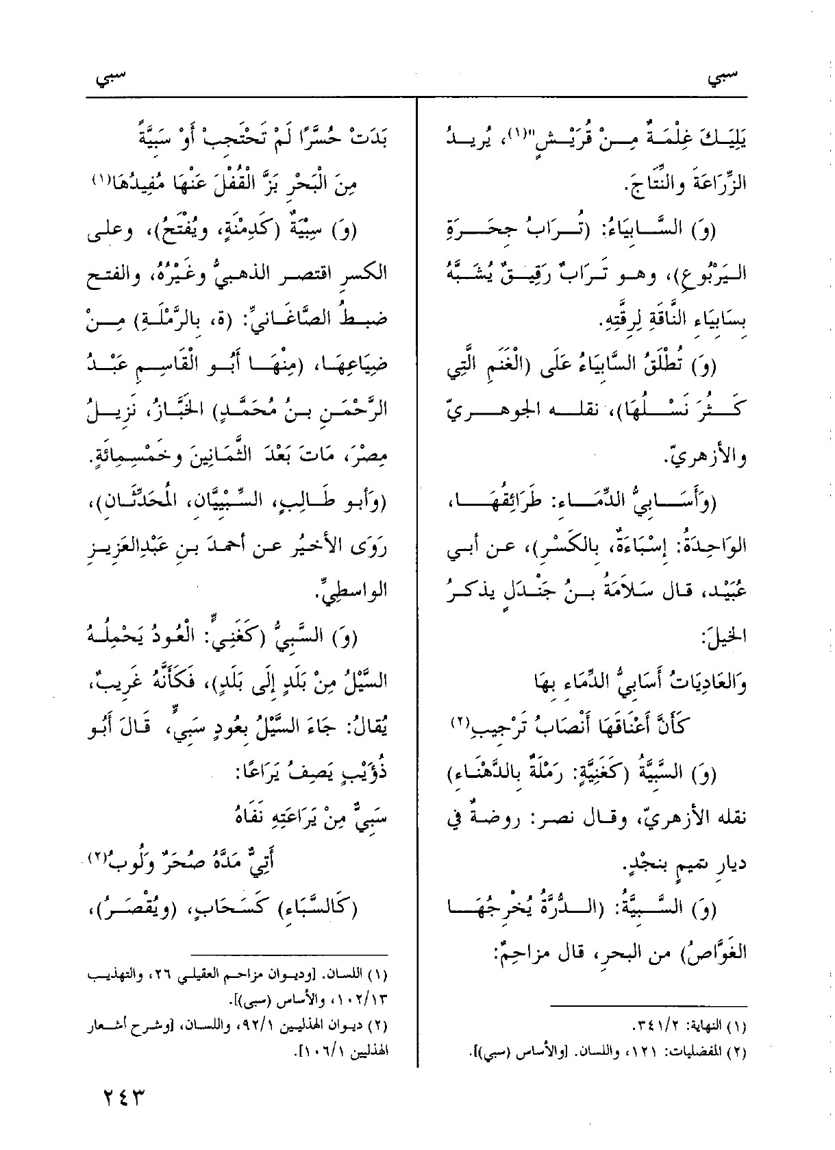 (و) } السَّبيَّةُ: (الدُّرةُ يُخْرجُها الغَوَّاصُ) مِن البَحْر؛ قَالَ مزاحِمٌ: