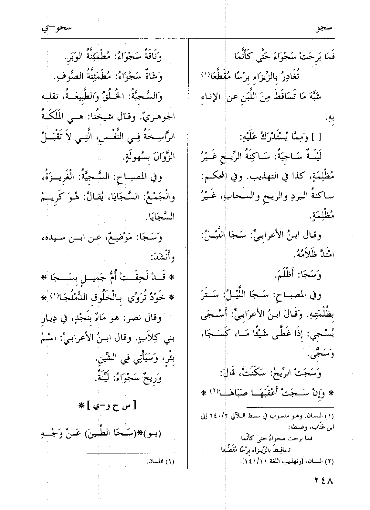 وَإِن {سَجَتْ أَعْقَبَها صَباها وناقَةٌ سَجْواءُ: مُطْمَئِنَّةُ الَوبَرِ.