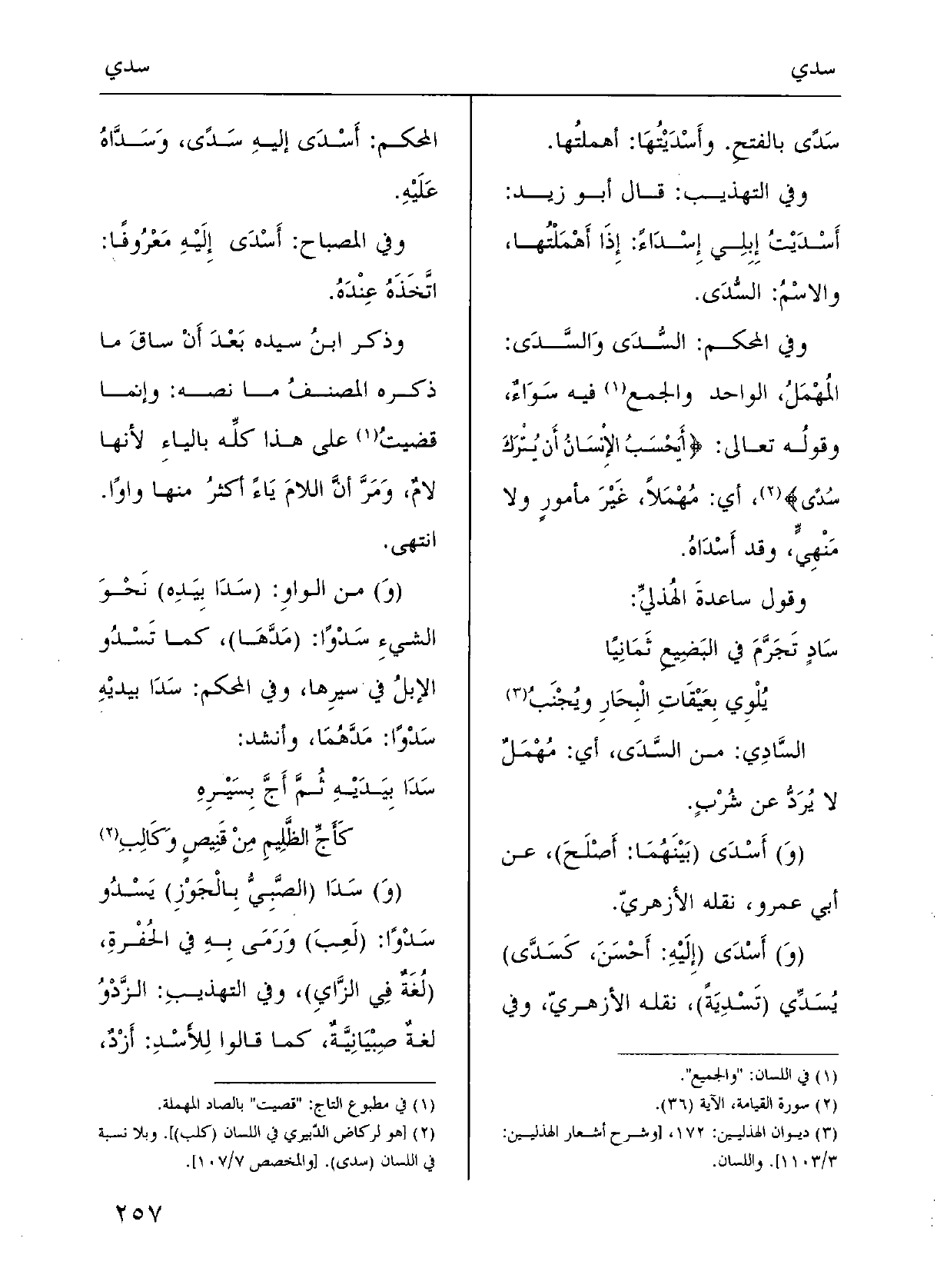 وقْولُه تَعَالَى: {أَيَحْسَبُ الإِنْسانُ أَن يُتْركَ} سُدىً} ، أَي مُهْملاً غَيْر مَأْمورٍ وَلَا مَنْهيّ، وَقد {أَسْداهُ؛ وقولُ ساعِدَةَ الهُذَلي: