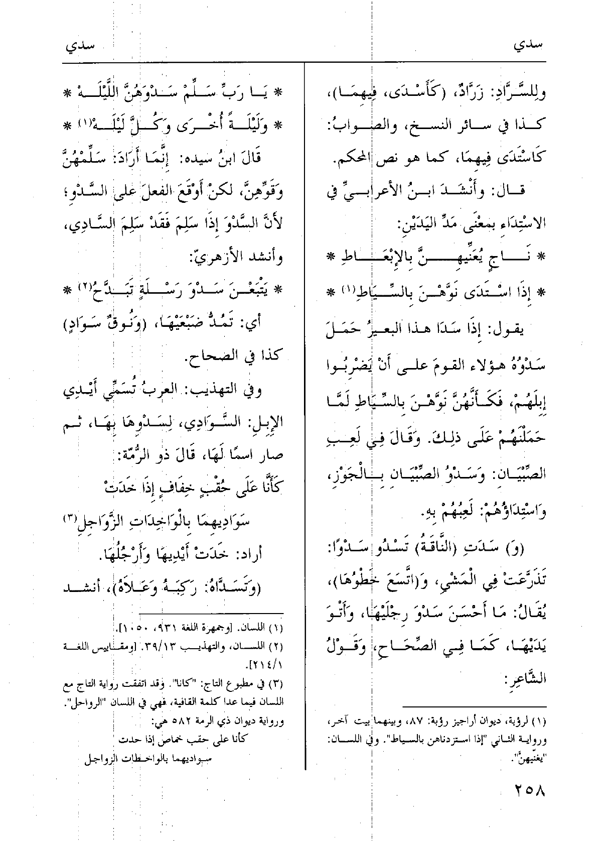 وَلَيْلَة أُخْرى وكلَّ ليْلَهْ قالَ ابنُ سِيدَه: إنَّما أَرادَ سَلِّمْهُنَّ وقَوِّهِنَّ، لَكِن أَوْقَعَ الفِعْلَ على} السّدْوِ لأنَّ السَّدْوَ إِذا سَلِمَ فقد سَلِمَ {السادِي؛ وأَنْشَدَ الأزهرِيُّ: