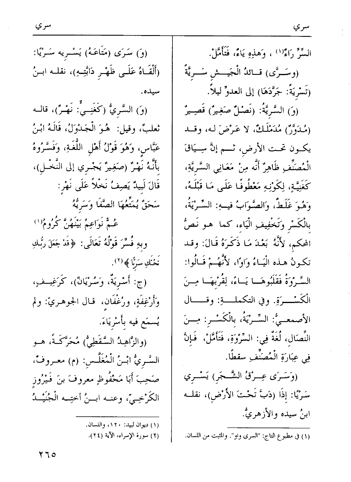 ثمَّ إنَّ سِياقَ المصنِّف ظاهِرٌ أنَّه من مَعَاني} السَّرِيَّةِ، كغَنِيَّة، لِكَوْنِه مَعْطوفاً على مَا قَبْلَه، وَهُوَ غَلَطٌ، والصَّوابُ فِيهِ السِّرْية، بالكَسْر، وتَخْفيفِ الياءِ، كَمَا هُوَ نَصُّ المُحْكَم، لأنَّه بَعْد مَا ذَكَرَه قالَ: وَقد تكونُ هَذِه الياءُ واواً لأنَّهم قَالُوا السِّرْوة فقَلَبُوها يَاء لقُرْبها مِن الكَسْرةِ.