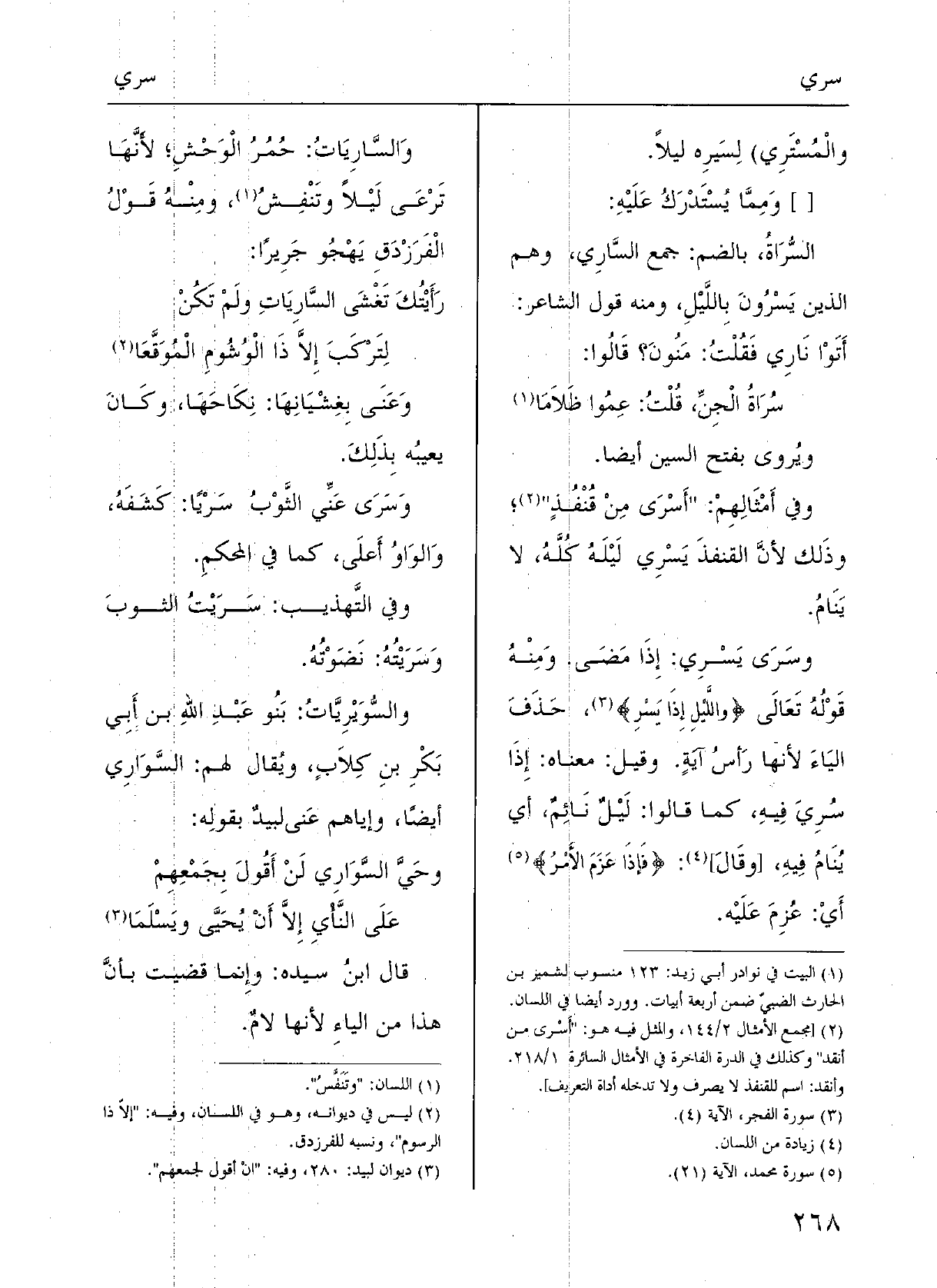 } والسارِياتُ: حُمُرُ الوَحْشِ لأنَّها تَرْعى لَيْلًا وتَنَفَّش، وَمِنْه قَوْلُ الفَرَزْدَق يَهْجُو جَرِيرًا: