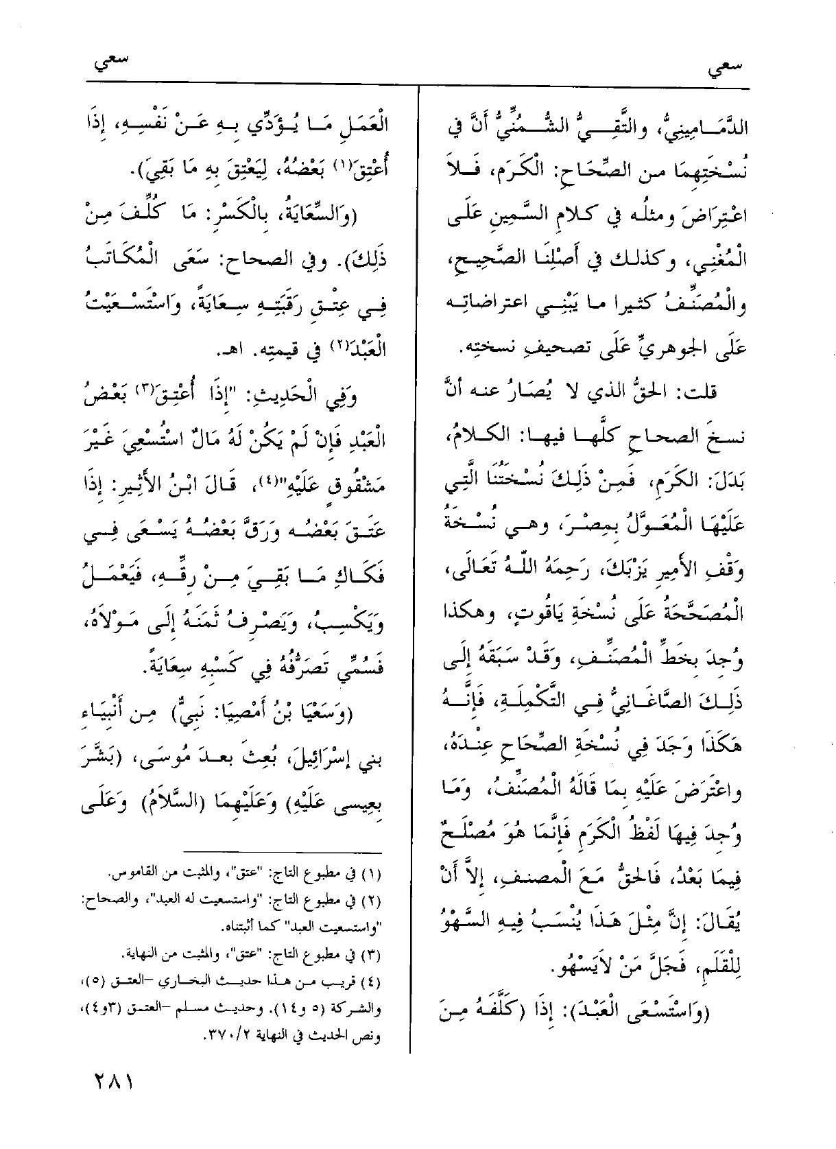 الدماميني والتقيُّ الشمنيّ أنَّ فِي نسختهما مِن الصِّحاحِ الكَرَم فَلَا اعْتِراضَ، ومِثْله فِي كَلامِ السَّمين على المُغْني، وكَذلِكَ فِي أَصْلِنا الصَّحِيح،؛ والمصنِّفُ كثيرا مَا يَبْنِي اعْترِاضَاتِهِ على الجوهريُّ على تَصْحيفِ نسْختِه.