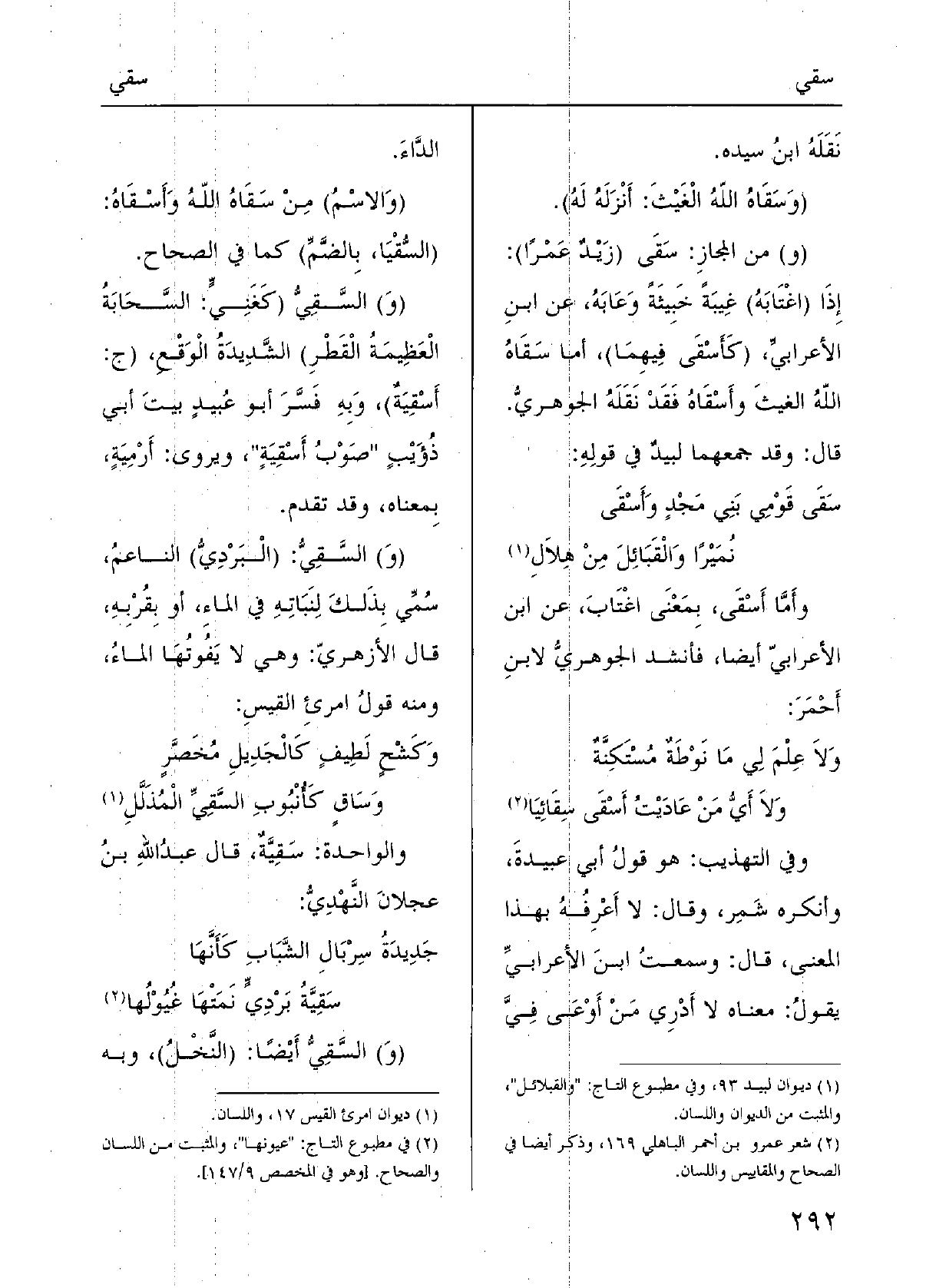 نُمَيْراً والقَبائِلَ من هِلال ِوأَمَّا {أَسْقَى بمعْنَى اغْتابَ، عَن ابنِ الأعرابيِّ أَيْضاً، فأَنْشَدَ الجوهريُّ لِابْنِ أَحْمر: