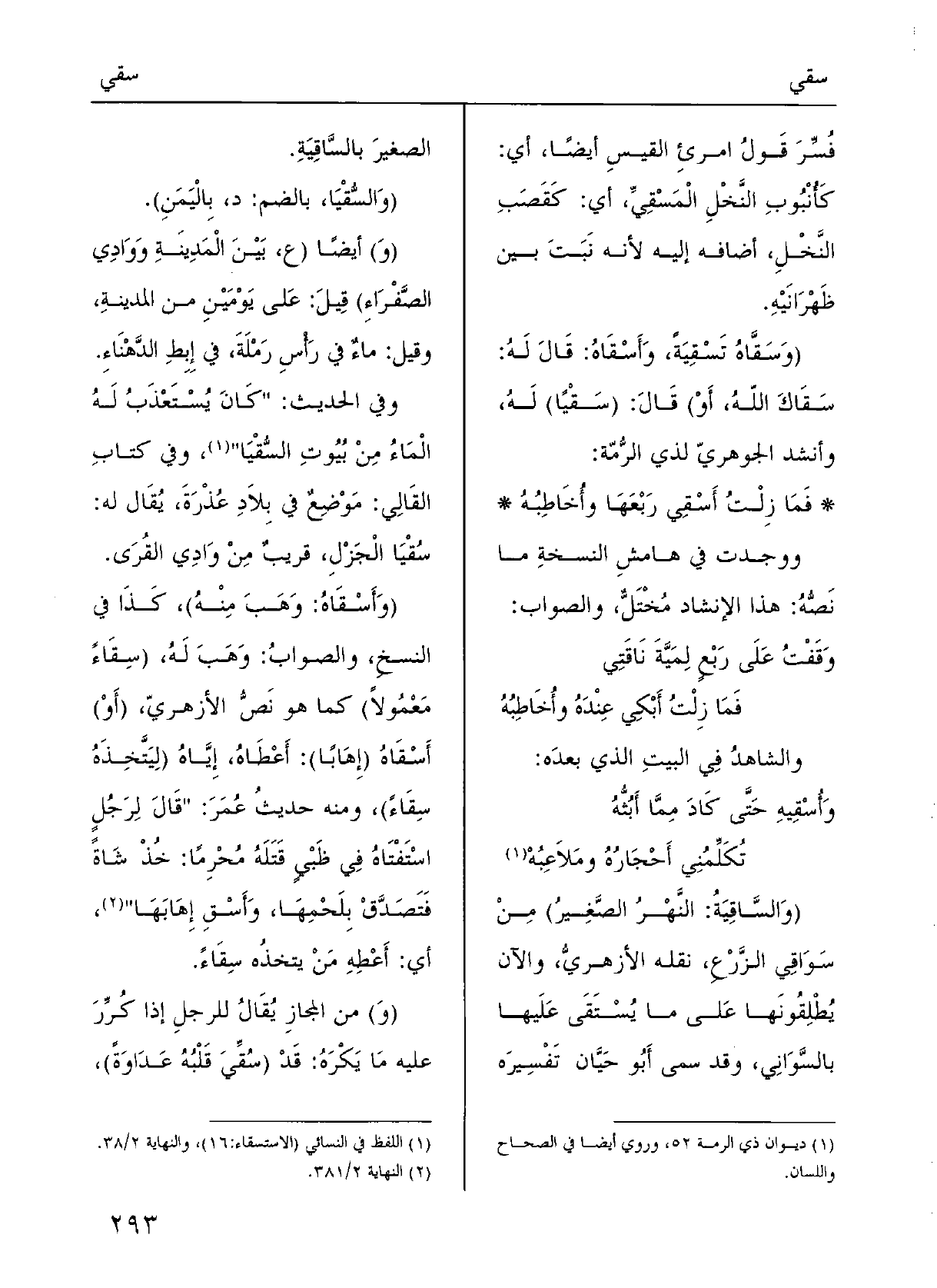 والآن يطلِقُونَها على مَا {يُسْتَقى عَلَيْهَا بالسّوانِي؛ وَقد سَمَّى أَبو حيَّان تَفْسِيرَه الصَّغير بالساقِيَةِ.