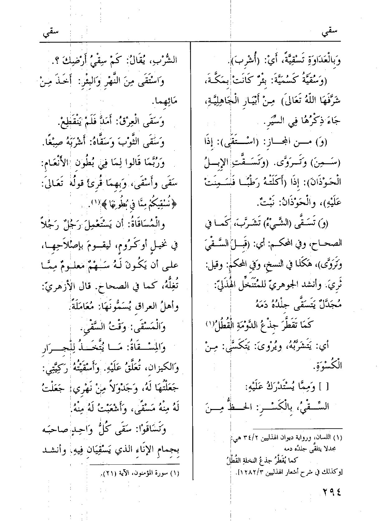 ورُبَّما قَالُوا لِمَا فِي بُطونِ الأنْعام} سَقى {وأَسْقى؛ وَبِهِمَا قُرىءَ قولُه تَعَالَى: {} نُسْقِيكُم ممَّا فِي بُطونِها} {والمُساقَاةُ: أنْ يَسْتَعْمِل رجُلٌ رجُلاً فِي نَخِيلٍ أَو كُرومٍ ليَقومَ بإصْلاحِها على أنْ يكونَ لَهُ سَهْمٌ مَعْلومٌ ممَّا تُغِلُّه؛ كَمَا فِي الصِّحاحِ.