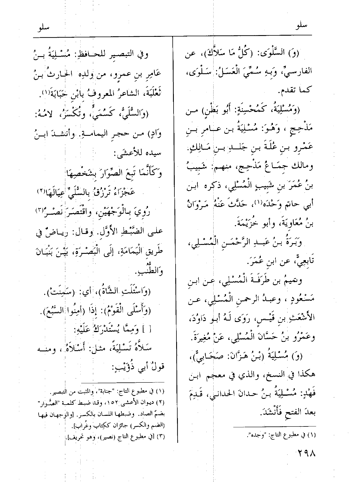 (} ومُسْلِيَةٌ، كمُحْسِنَةٍ: أَبو بَطْنٍ) مِن مَذْحَج، وَهُوَ {مُسْلِيَةُ ابنُ عامِرِ بنِ عَمْروِ بنِ علةَ بنِ جلدِ بنِ مالِكٍ، وَمَالك جماع مذْحج، مِنْهُم: شبيبُ بنُ عُمَر بن شبيبٍ} المُسْلِيُّ ذَكَرَه ابنُ أَبي حاتِمٍ وجده حدَّثَ عَنهُ مَرْوانُ بنُ معاوِيَةَ وأَبو خزيمَةَ؛ وبرةُ بنُ عبدِ الرحمنِ المُسْلِيُّ تابِعِيٌّ عَن ابنِ عُمَرَ؛ وتميمُ بنُ طرفَةَ المُسْليُّ عَن ابنِ مَسْعودٍ؛ وعبدُ الرحمنِ المُسْلي عَن الأَشْعَثِ بنِ قَيْسٍ، رَوَى أَبو دَاوُد؛ وعَمْروُ بنُ حسَّان المُسْلي عَن مُغيرَة.