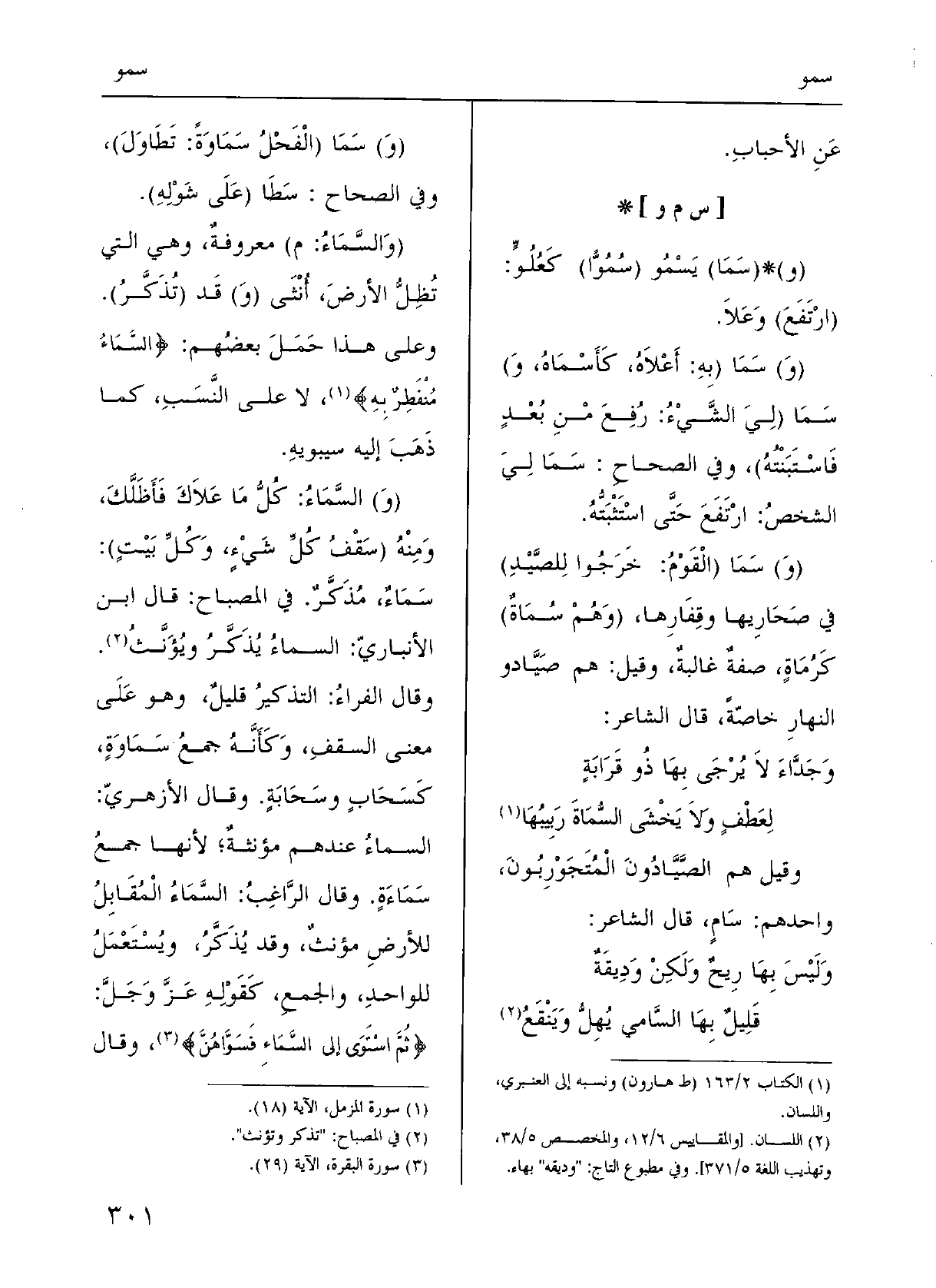 وقالَ الرَّاغبُ: السَّماءُ المُقابِلَةُ للأَرْضِ مُوءَنَّثٌ وَقد يُذَكَّرُ ويُسْتَعْملُ للواحِدِ والجَمْعِ كقوْلِه، عزَّ وجلَّ: {ثمَّ اسْتَوَى إِلَى السَّماءِ فسَوَّاهنَّ} ؛ وقالَ،