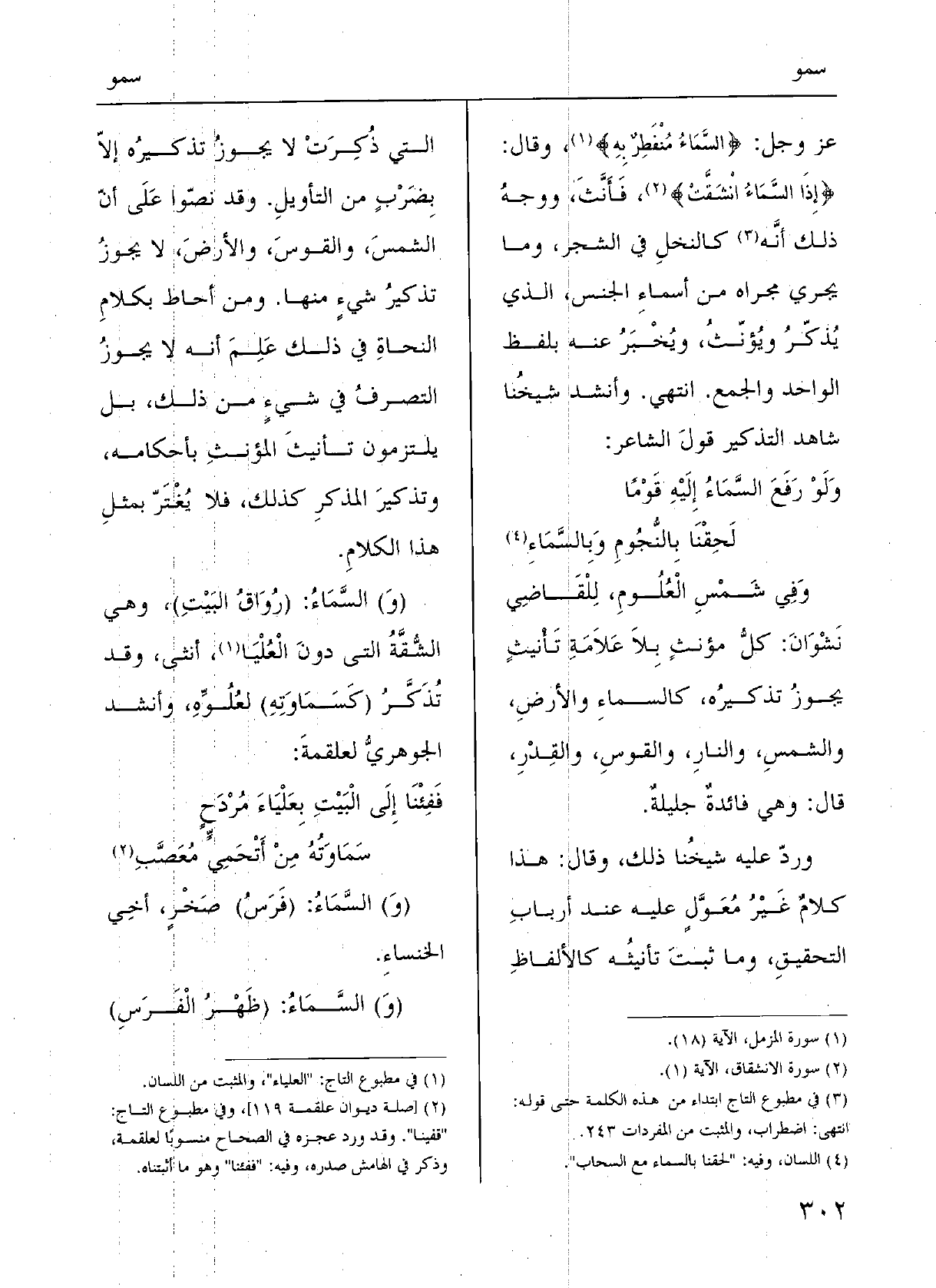 عزَّ وجلَّ: {السَّماءُ مُنْفَطِرٌ بِهِ} ؛ وقالَ: {إِذا السَّماءُ انْشَقَّتْ} ، فأَنَّثَ، ووَجْهُ ذلكَ أَنَّه كالنَّخْل والشَّجَر وَمَا يَجْرِي مُجْراهُما مِن أَسْماءِ الأجْناسِ الَّتِي تُذَكَّر وتُؤنَّث، ويُخَيَّرُ عَنهُ بلفظِ الواحِدِ والجَمْع، انتَهَى.