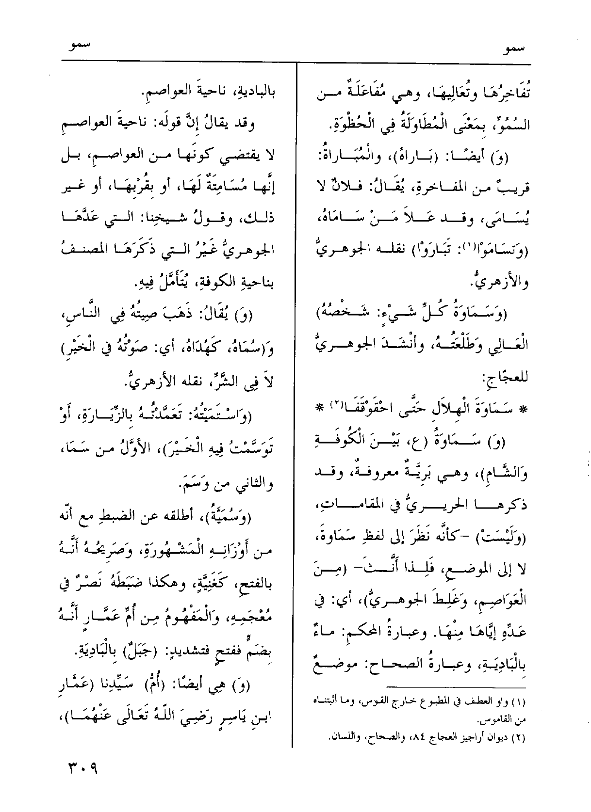 } سَماوَةَ الهِلالِ حَتَّى احْقَوْقَفا (و) سَماوَةُ: (ع بينَ الكُوفَةِ والشَّام) ، وَهِي بَرِّيَّة مَعْروفَةٌ؛ وَقد ذَكَرَها الحرِيرِي فِي المَقامَات؛ (ولَيْسَت) ؛ كأَنَّه نَظَرَ إِلَى لَفْظِ سَماوَة لَا إِلَى المَوْضِع فَلِذَا أَنَّثَ؛ (مِن العَواصِمِ.