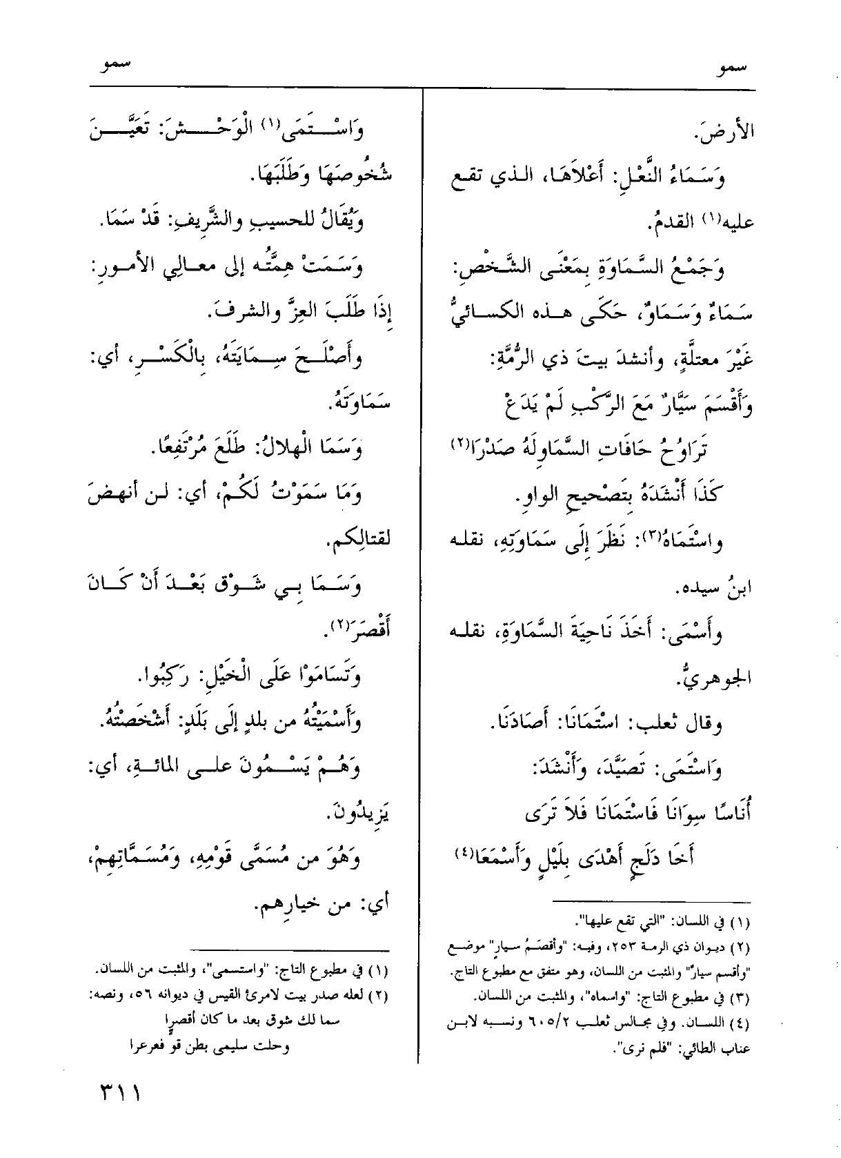 وجَمْعُ السَّماوَةِ، بمعْنَى الشَّخْص، سَماءٌ} وسَماوٌ، حَكَى هَذِه الكِسائيُّ غيرَ مُعْتَلَّة، وأَنْشَدَ بيتَ ذِي الرُّمَّة: