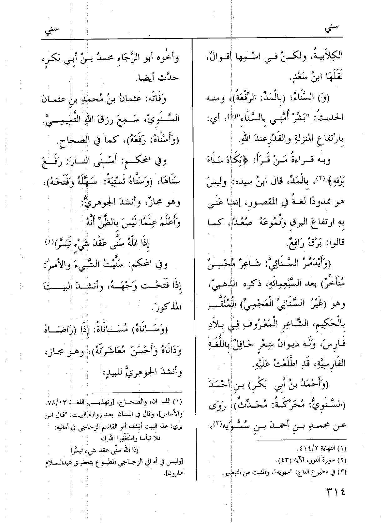 وَفِي المُحْكم: {أَسْنَى النارَ: رَفَعَ سَنَاها.