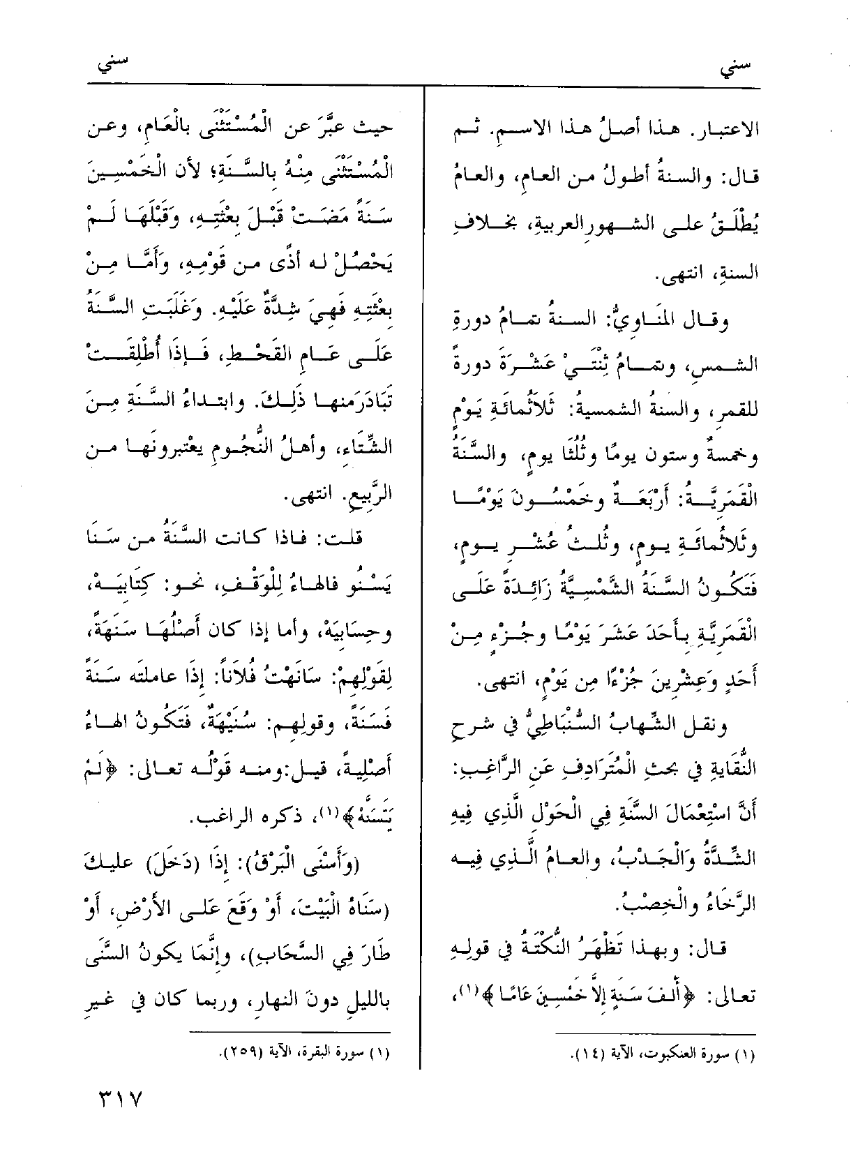 ونقلَ الشَّهاب السّنْباطي فِي شَرْح النقاية فِي بَحْث المُتَرادِف عَن الرَّاغب: أَنَّ اسْتِعْمالَ السَّنَةِ فِي الحَوْل الَّذِي فِيهِ الشدَّةِ والجَدْب، وَالْعَام الَّذِي فِيهِ الرَّخاء والخِصْب، قالَ: وَبِهَذَا تَظْهرُ النّكْتَة فِي قوْله تَعَالَى: {أَلْف سَنَة إلاَّ خَمْسينِ عَاما} ، حَيْثُ عَبَّر عَن المُسْتَثْنى بِالْعَام، وَعَن المُسْتَثْنى مِنْهُ بالسَّنَة، لأنَّ الخَمْسين سَنَة مَضَتْ قَبْل بعْثَتِه وقَبْلها لم يَحْصَل لَهُ أَذىً مِن قوْمِ، وأَمَّا من بعْثَتِه فَهِيَ شدَّةٌ عَلَيْهِ، وغَلَبَت السَّنَة على عامِ القَحْط، فَإِذا أَطْلَقْت تَبادَرَ مِنْهَا ذلكَ، وابْتِداءُ السَّنَةِ من الشَّتاءِ، وأَهْلُ النُّجوم يَعْتبرُونَها مِن الرَّبيع، انتَهَى.