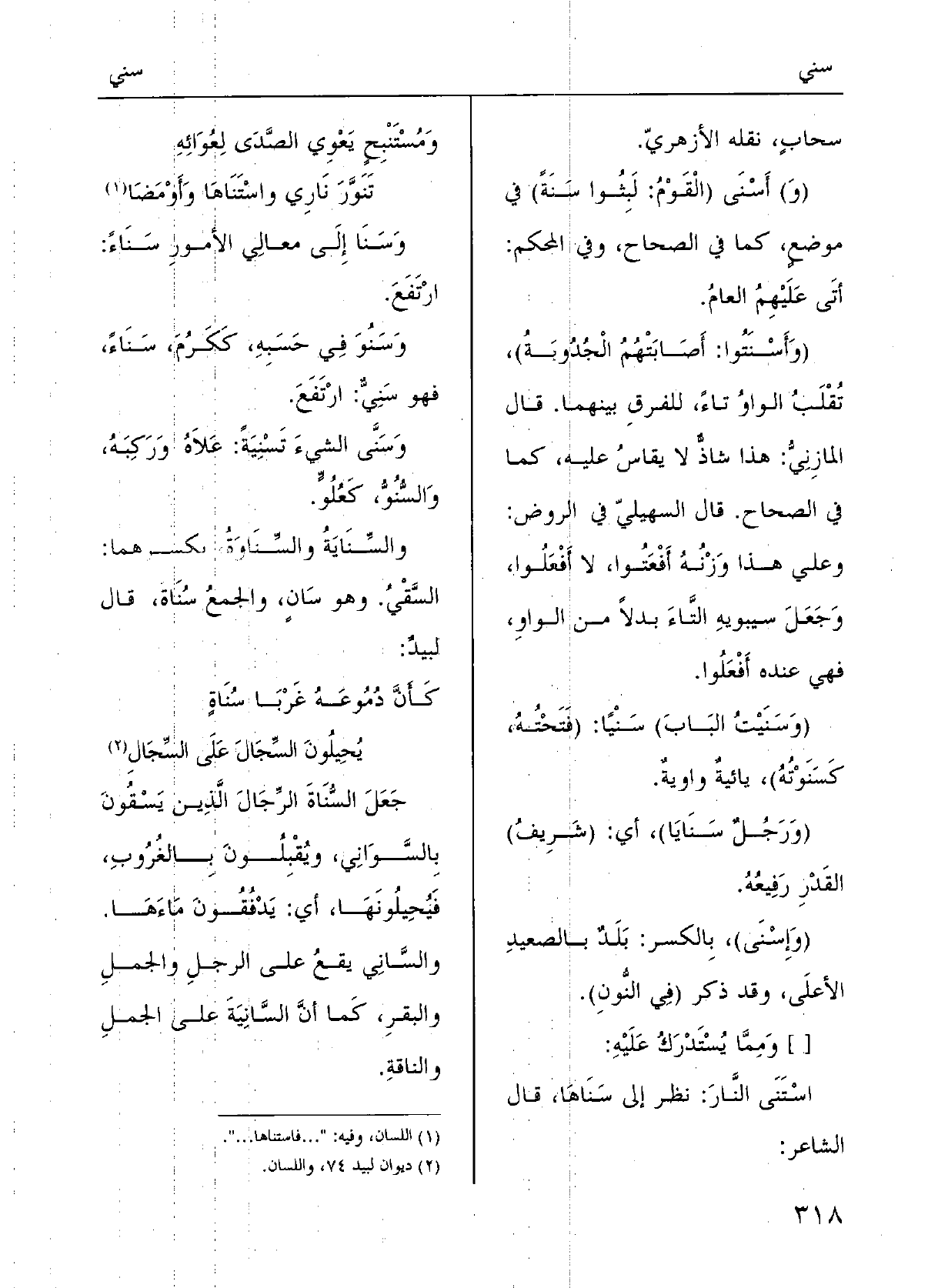 والسُّنُوُّ، كعُلُوَ،} والسِّنايَةُ والسِّناوَةُ، بكسْرِهما: السَّقْي، وَهُوَ {سانٍ والجَمْعُ} سُناةٌ؛ قالَ لبيدٌ: