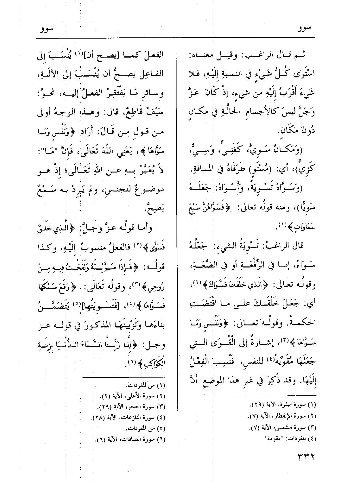 قالَ الرَّاغبُ: {تَسْوِيَةُ الشيءِ جَعْلَه} سَواء إمَّا فِي الرّفْعَةِ أَو فِي الضِّعَةِ.