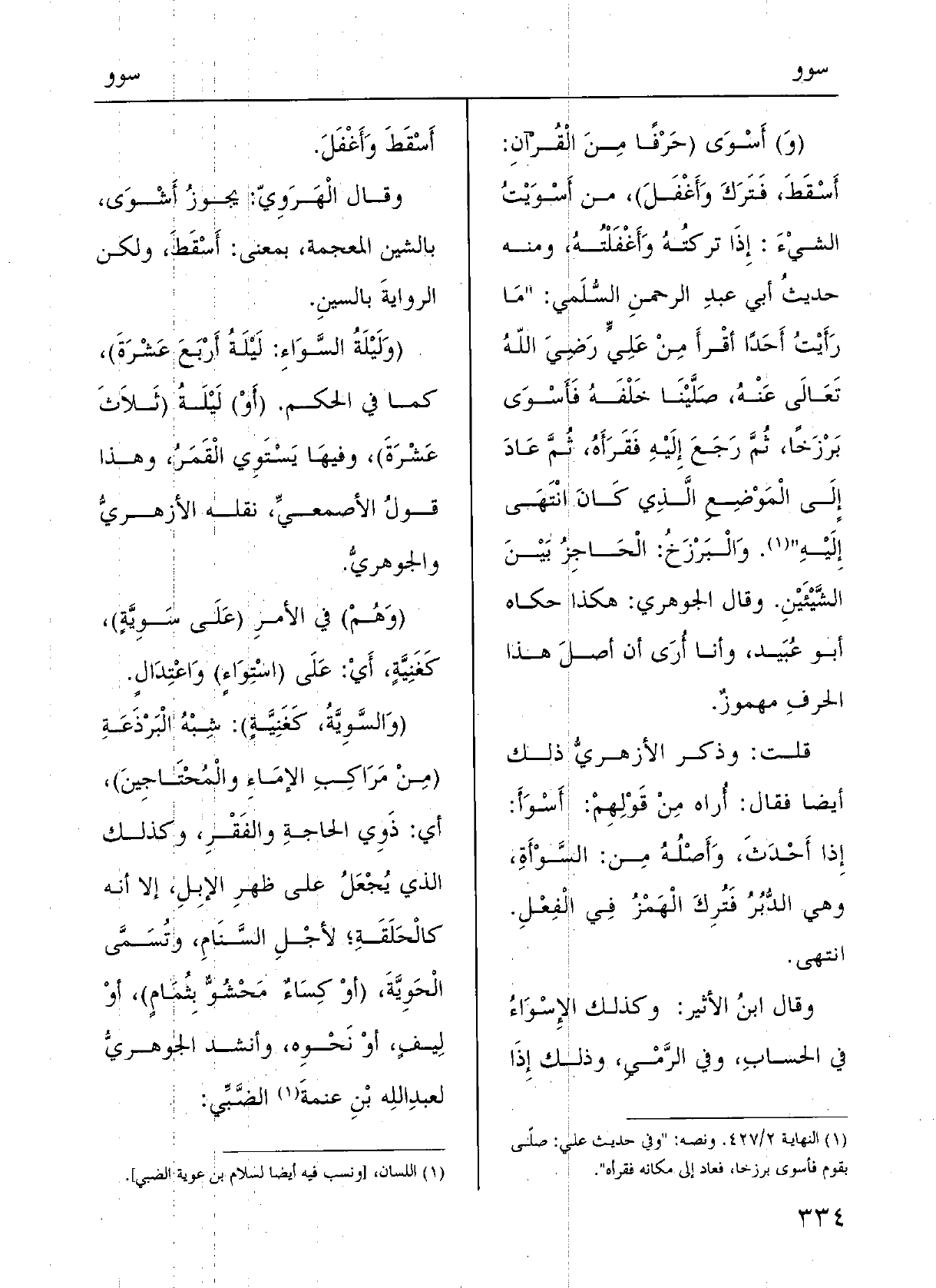 (و) أَسْوَى (حَرْفاً من القرآنِ: أَسْقَطَ وتَرَكَ وأَغْفَل) ، مِن {أَسْوَيْتُ الشيءَ إِذا تَرَكْته وأَغْفَلْته؛ وَمِنْه حديثُ أَبي عبدِ الرحمنِ السُّلمي: (مَا رأَيْتُ أَحَداً أَقْرَأ مِن عليَ، رضِيَ اللَّهُ تَعَالَى عَنهُ، صلَّيْنا خَلْفَه} فأَسْوَى بَرْزخاً ثمَّ رجعَ إِلَيْهِ فقَرَأَه، ثمَّ عادَ إِلَى المَوْضِع الَّذِي كانَ انْتَهى إِلَيْهِ) ؛ والبَرْزخُ: الحاجِزُ بينَ الشَّيْئَين.