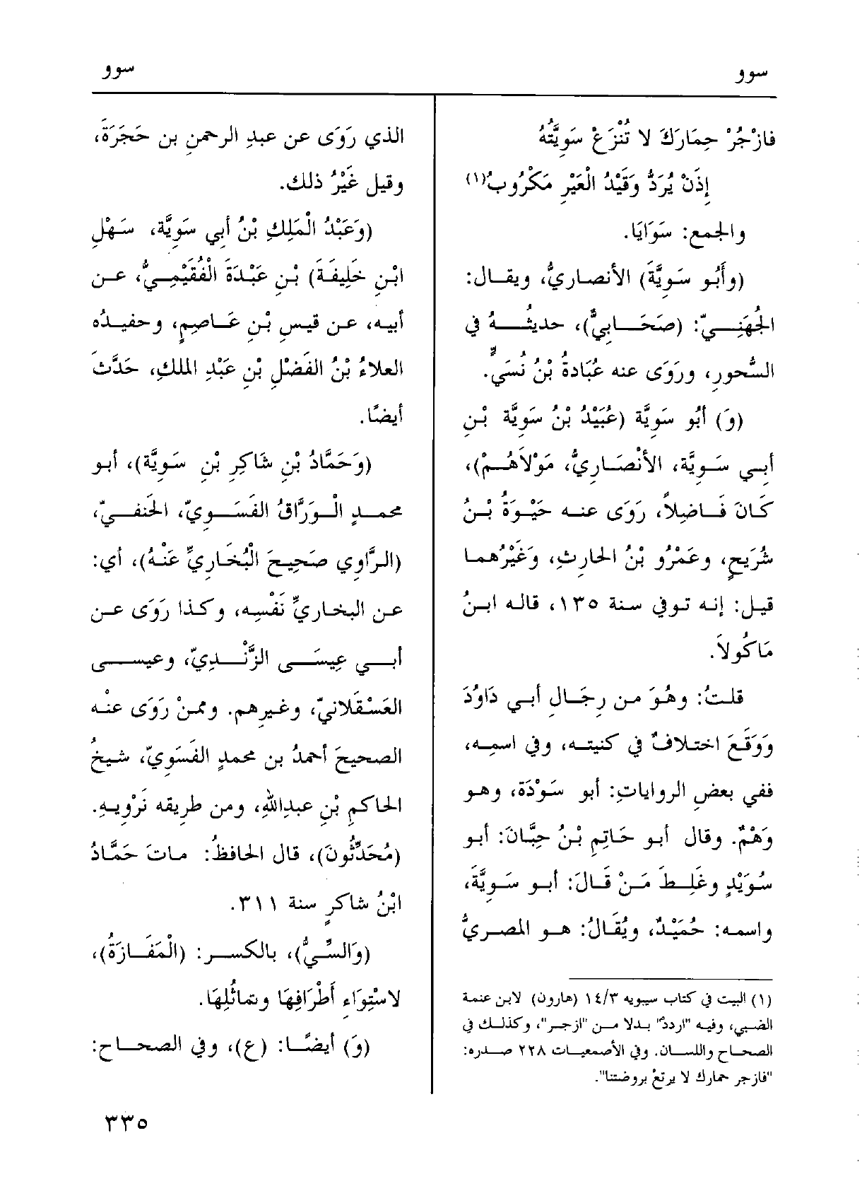 قلْت: وَهُوَ مِن رِجال أَبي دَاوُد، ووَقَعَ اخْتِلافٌ فِي كُنْيَتِه وَفِي اسْمِه، فَفِي بعضِ الرِّوايات أَبو سَوْدَةَ وَهُوَ وَهمٌ؛ وقالَ أَبو حاتِم بنُ حبَّان: أَبو سُوَيْد وغَلِطَ مَنْ قالَ أَبو} سَوِيَّةَ، واسْمُه حُمَيْد، ويقالُ: هُوَ المِصْرِيُّ الَّذِي رَوَى عَن عبدِ الرحمنِ بنِ حجرَةَ، وقيلَ غيرُ ذلكَ.
