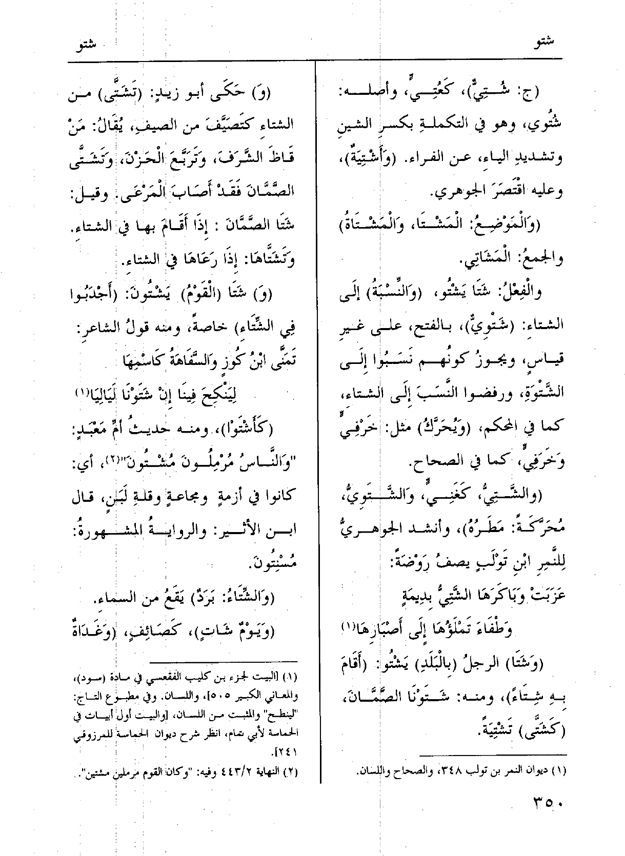 وقيلَ:} شَتَا الصَّمَّان إِذا أَقامَ بهَا فِي الشِّتاءِ، {وتَشَتَّاها إِذا رَعَاها فِي الشَّتاءِ.