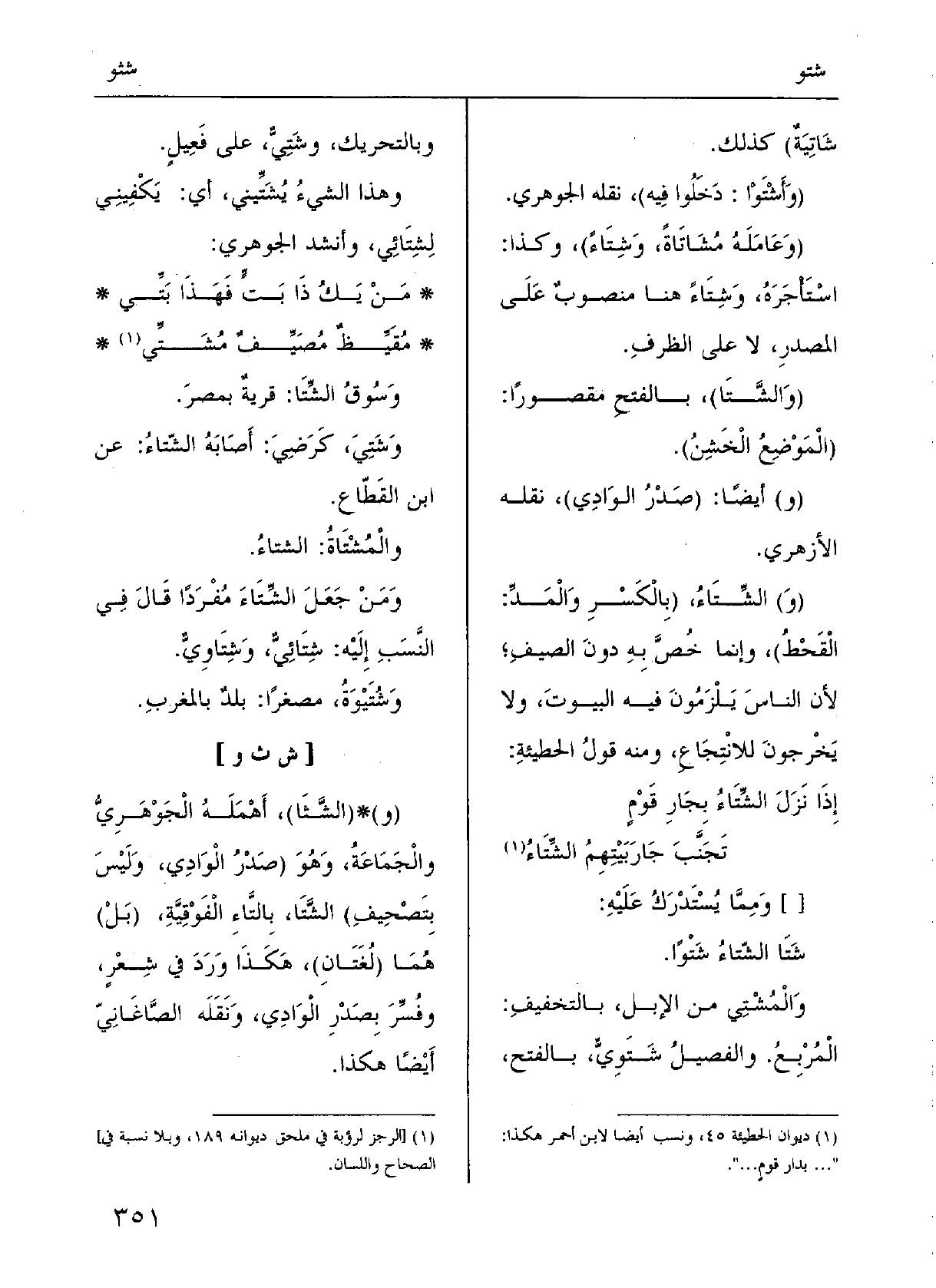 ومَنْ جَعَلَ الشِّتاءَ مُفْرداً قالَ فِي النَّسب إِلَيْهِ {شِتائِيٌّ} وشِتاوِيٌّ.