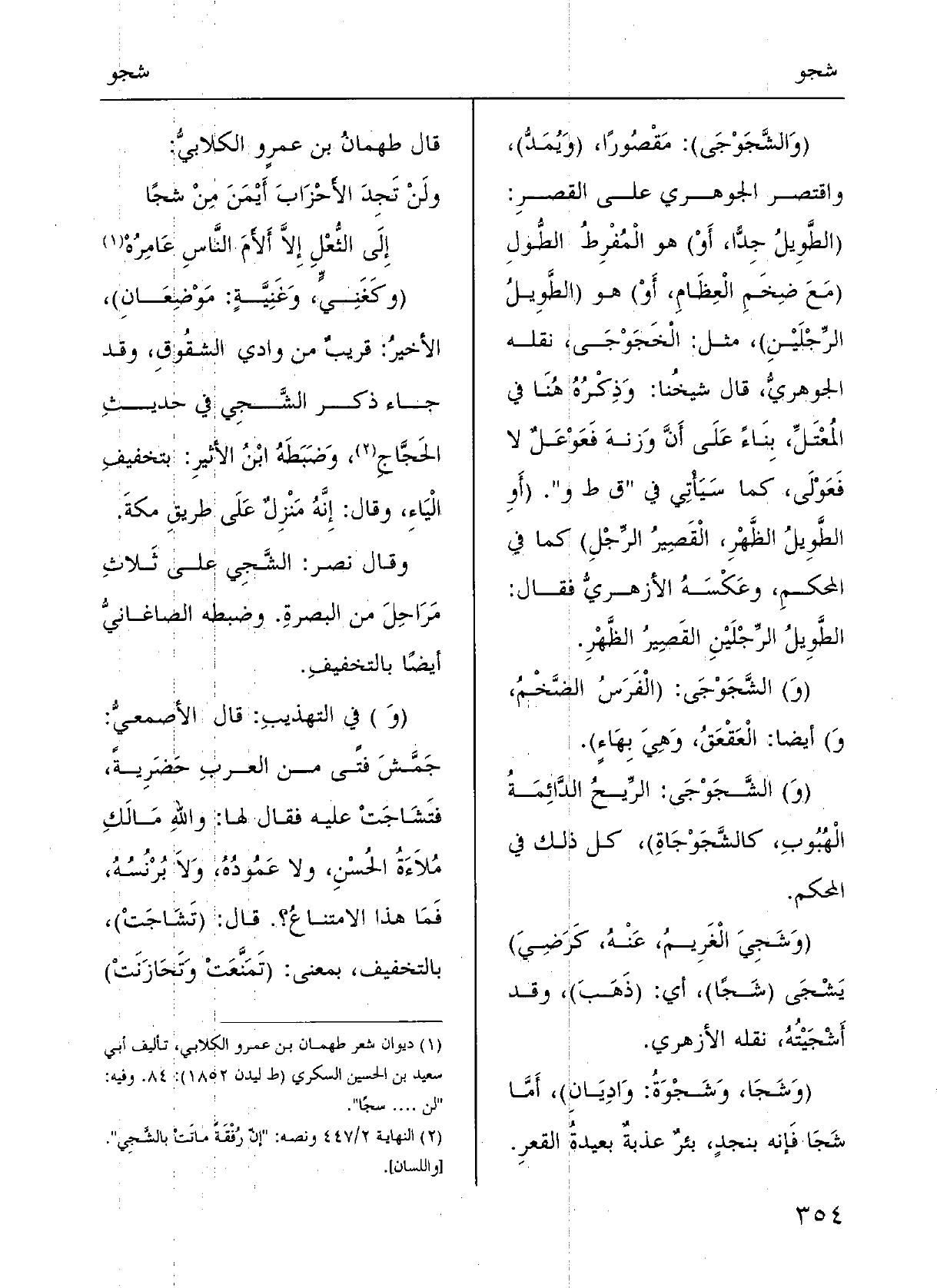 (} وشَجَا {وشَجْوةُ: وادِيانِ) ؛ أَمَّا شَجَا فإنَّه بنَجْدٍ بِئْرٌ عَذْبَةٌ بعيدَةُ القَعْرِ؛ قالَ طهمانُ بنُ عَمْروٍ الكِلابي: