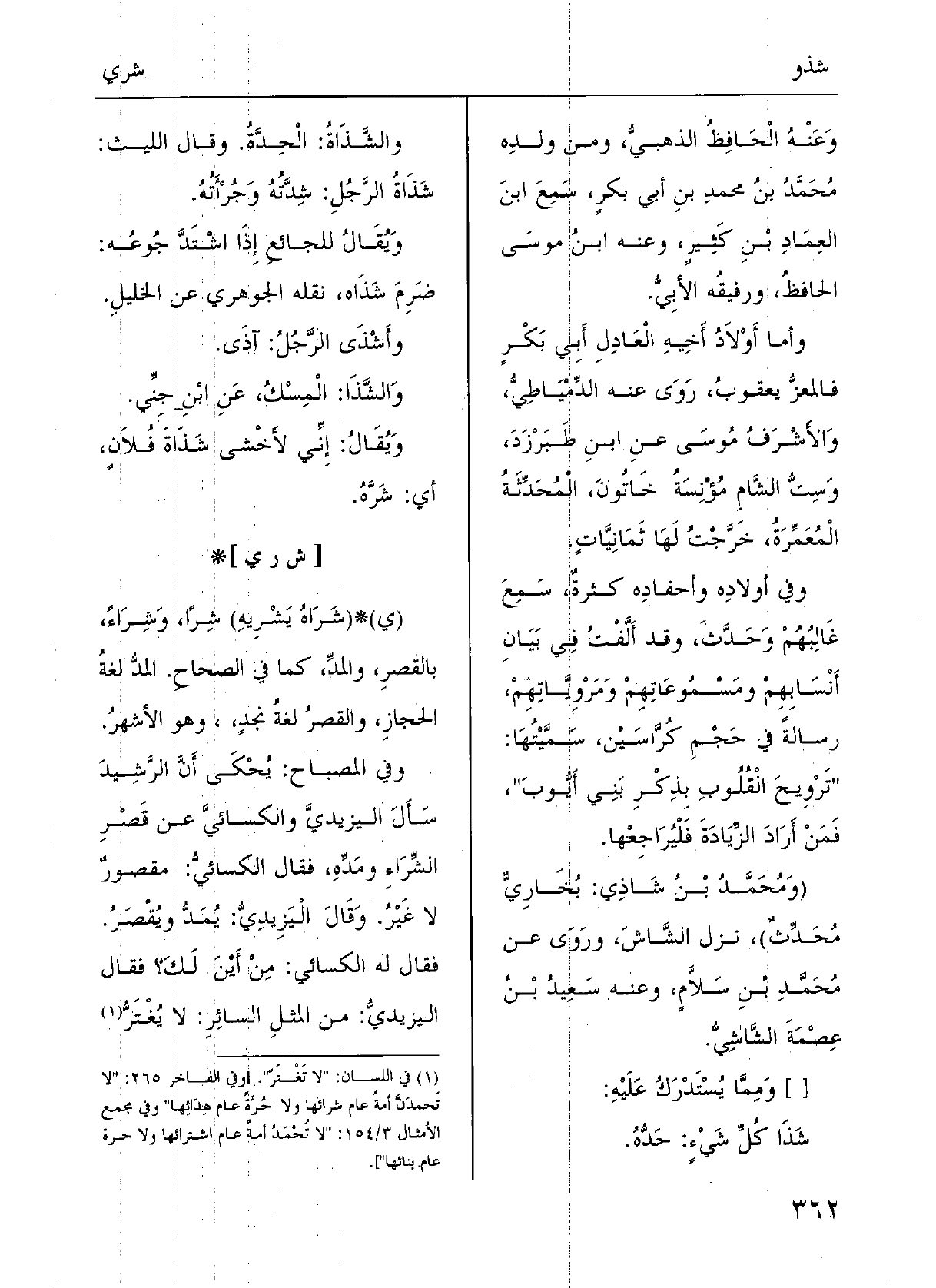 فِي المِصْباح: يُحْكَى أنَّ الرَّشيدَ سألَ اليَزيِدي والكِسائي عَن قَصْرِ} الشِّراءِ ومَدِّه، فقالَ الْكسَائي: مَقْصورٌ لَا غَيْر؛ وقالَ اليَزيدِي: يُمَدُّ ويُقْصَرُ، فقالَ لَهُ الكِسائي: مِن أَيْن لكَ؛ فقالَ اليَزِيدي: من المَثَلِ السَّائِرِ: (لَا يُغْتَرُّ