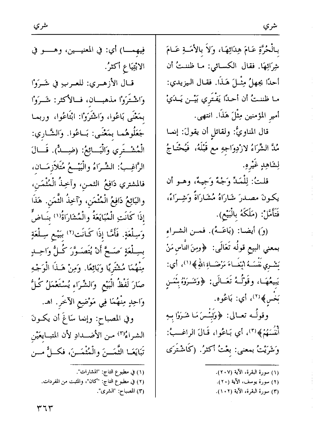 فَمن {الشَّراء بمعْنَى البَيْع قوْله تَعَالَى: {ومِن الناسِ مَنْ} يَشْرِي نفسَه ابْتغاءَ مَرْضاةِ ا} ، أَي يَبيعُها؛ وقوْله تَعَالَى: { {وشَرَوْهُ بثمَنٍ بخْسٍ} ، أَي باعُوه؛ وَقَوله تَعَالَى: {ولبِئْسَ مَا} شَرَوْا بِهِ أَنْفُسَهُم} ، أَي باعُوا.