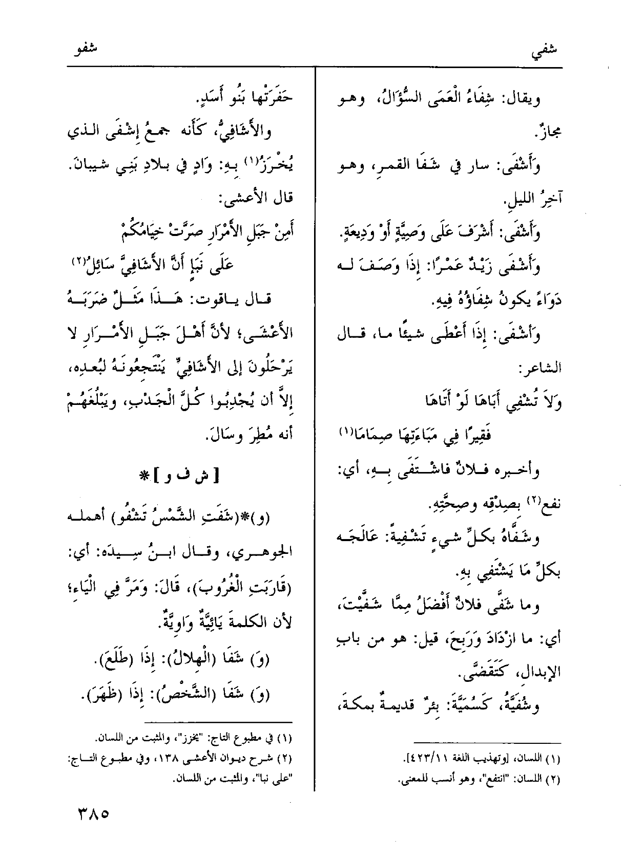 على نَبَأٍ إِن} الأشافيّ سائلُ قالَ ياقوت: هَذَا مَثَلٌ ضَرَبَه الأَعْشى، لأنَّ أَهْلَ جَبَلِ الأَمْرارِ لَا يَرْحلُون إِلَى الأشافِي يَنْتجِعُونَه لبُعْدِه إلاَّ أَن يَجْدبُوا كلَّ الجَدْبِ ويبلغهم أنَّه مطرَ وسالَ.