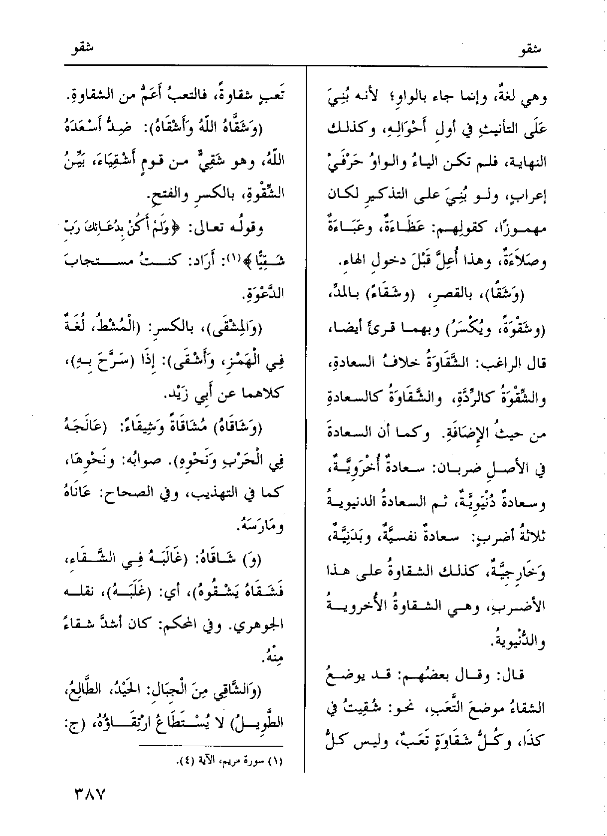 قالَ الرَّاغبُ:} الشَّقاوَةُ خِلافُ السَّعادَةِ {والشّقْوَةُ كالرِّدَّةِ،} والشّقاوَةُ كالسَّعادَةِ من حيثُ الإضافَةِ، وكما أَنَّ السَّعادَةَ فِي الأصْلِ ضَرْبان: سَعادَةٌ أُخْرويَّةٌ، وسَعادَةُ دُنْيويَّة، ثمَّ السَّعادَةُ الدّنْيويَّةُ ثلاثَةُ أَضْربٍ: سَعادَةٌ نَفْسيَّةٌ وبدنيَّةٌ وخارجيَّةٌ، كَذلكَ {الشَّقاوَةُ على هَذِه الأَضْربِ، وَهِي الشَّقاوَةُ الأُخرويَّةُ والدّنْيويَّةُ.