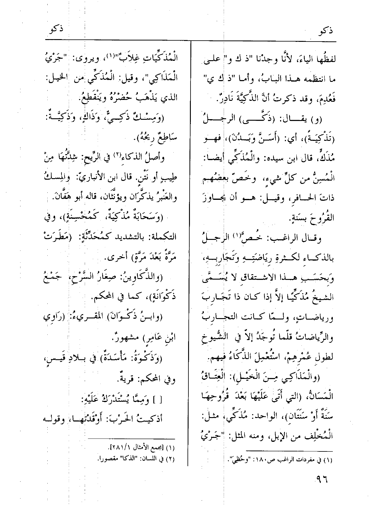 وقالَ الراغبُ: خُصَّ الرَّجُل} بالذَّكاءِ لكَثْرَةِ رِياضَتِه وتَجاربِه، وبحسَبِ هَذَا الاشْتِقاقِ لَا يُسَمَّى الشيخُ {مُذكّياً إلاَّ إِذا كانَ ذَا تَجارِب ورِياضاتٍ، ولمَّا كانتِ التّجاربُ والرِّياضاتُ قلَّما تُوجَدُ إلاَّ فِي الشّيوخِ لطُولِ عمرِهم اسْتُعْمل الذَّكاءُ فيهم.