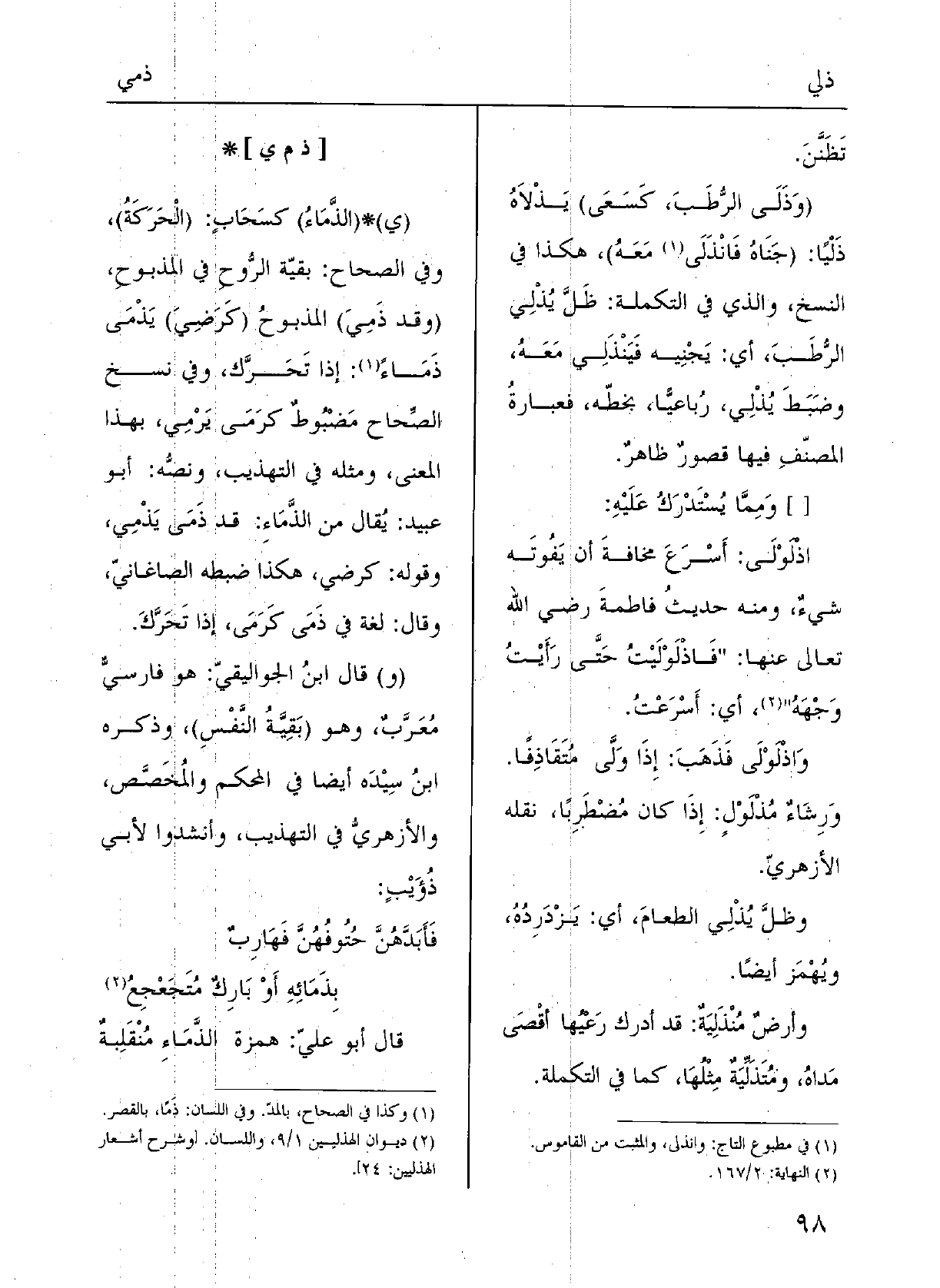 وَفِي نسخِ الصِّحاحِ مَضْبوط كرَمَى يَرْمِي بِهَذَا المعْنى، ومثْلُه فِي التَّهذيبِ وَنَصه: أَبو عبيدٍ: يقالُ مِن الذَّماءِ: قد {ذَمِيَ} يَذْمَى؛ وقوْلُه كرَضِيَ، هَكَذَا ضَبَطَه الصَّاغاني وقالَ: لُغَةٌ فِي ذَمَى كرَمَى إِذا تحرَّكَ.