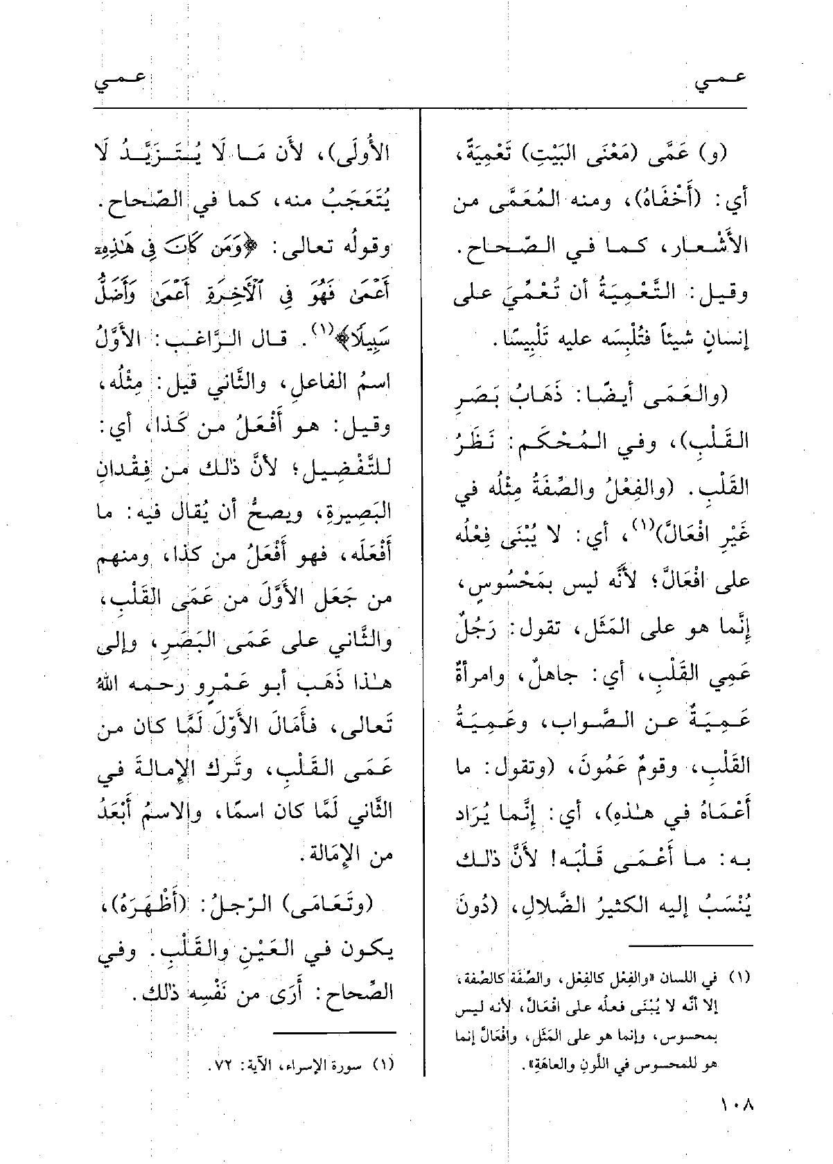 قالَ الراغِبُ: الأوَّلُ اسْمُ الفاعِلِ وَالثَّانِي قيلَ مِثْله، وقيلَ هُوَ أَفْعَلُ من كَذَا، أَي للتَّفْضِيل، لأنَّ ذلكَ مِن فقْدَانِ البَصِيرَةِ، ويَصحُّ أَنْ يقالَ فِيهِ مَا أَفْعَله، فَهُوَ أَفْعَل مِن كَذَا؛ وَمِنْهُم مَنْ جَعَلَ الأوَّل مِن {عَمَى القَلْب، والثَّاني على عَمَى البَصَرِ، وَإِلَى هَذَا ذَهَبَ أَبو عَمْرٍ و، رحِمَهُ اللهُ تَعَالَى، فأَمَالَ الأوّل لما كانَ مِن عَمَى القَلْبِ وتَرَكَ الإمالَةَ فِي الثَّانِي لما كَانَ اسْماً، والاسْمُ أَبْعَد من الإمالَةِ.