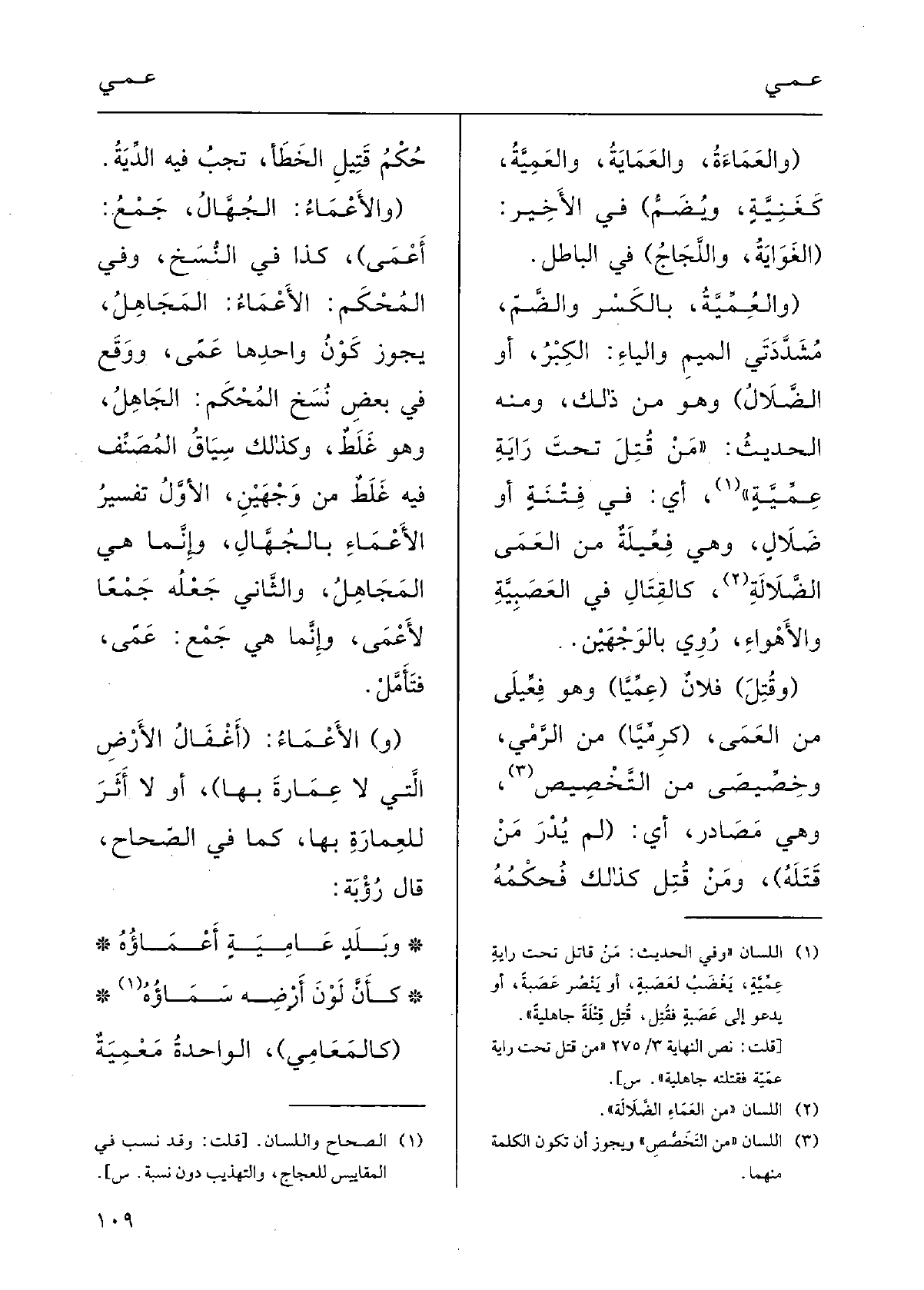 ووَقَع فِي بعضِ نسخِ المُحْكم الجاهِلُ، وَهُوَ غَلَطٌ، وكذلكَ سِياقُ المصنِّف فِيهِ غَلَطٌ من وَجْهَيْن: الاوَّل: تَفْسِيرُ الأَعْماءِ بالجُهَّالِ وَإِنَّمَا هِيَ المَجاهِلُ؛ وَالثَّانِي: جَعَلَهُ جَمْعاً {لأَعْمى وإنَّما هِيَ جَمْعُ عَمًى، فتأَمَّل.