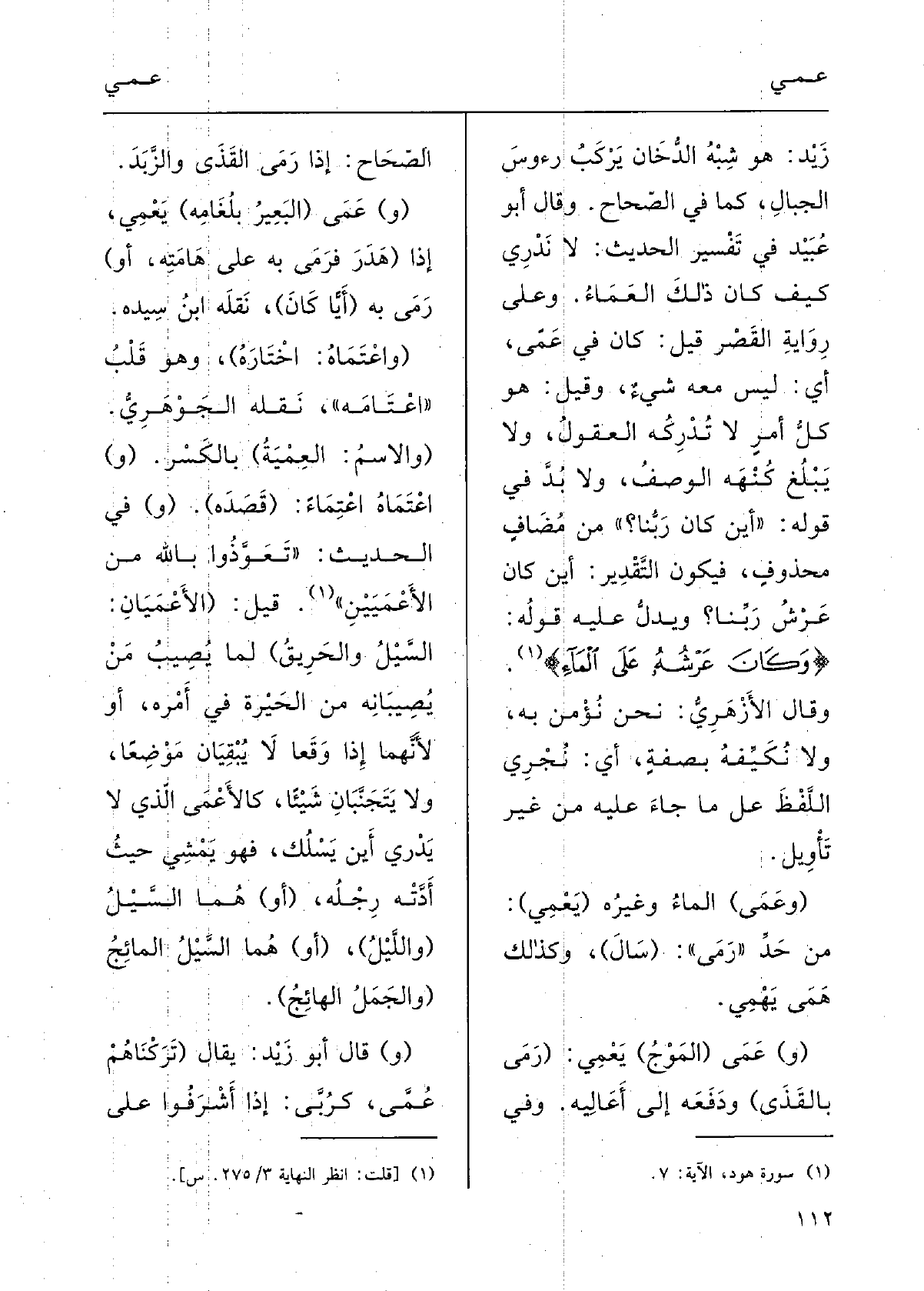 وقالَ أَبو عبيدٍ فِي تفْسِيرِ الحديثِ: لَا نَدْري كيفَ كانَ ذلكَ {العَماءُ. وعَلى رِوايَةِ القَصْر قيلَ: كَانَ فِي عِمًى أَي ليسَ مَعَه شيءٌ، وقيلَ: هُوَ كلُّ أَمْرٍ لَا تُدْرِكُه العُقُولُ وَلَا يَبْلُغُ كُنْهَه الوَصْفُ، وَلَا بُدَّ فِي قوْلِه: أَيْنَ كانَ رَبُّنا مِن مُضافٍ مَحْذُوفٍ فيكونُ التَّقديرُ: أَيْنَ كانَ عَرْشُ رَبِّنا، ويدلُّ عَلَيْهِ قوْلُه: وكانَ عَرْشُه على الماءِ.