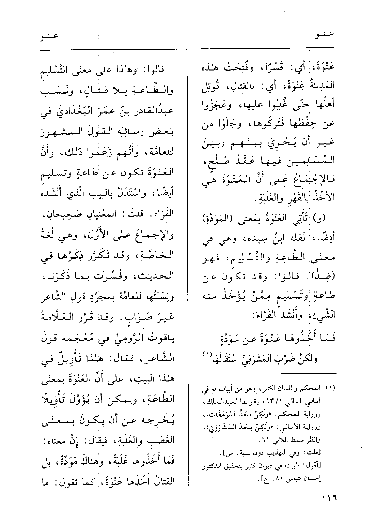 قُلْت: المَعْنيانِ صَحِيحانِ والإجْماعُ على الأوَّلِ، وَهِي لُغَةُ الخاصَّةِ وَقد تكَرَّرَ ذِكْرُها فِي الحديثِ، وفُسِّرتْ بِمَا ذَكَرْنا ونِسْبَتها للعامَّة بمجرّدِ قَوْل الشاعِرِ غَيْرُ صَوابٍ، وَقد قرَّرَ العلاَّمَةُ ياقوتٌ الرُّومي فِي مُعْجمهِ قَوْل الشاعِرِ فقالَ: هَذَا تَأْوِيلٌ فِي هَذَا البَيْتِ على أَنَّ العَنْوَةَ بمعْنَى الطَّاعَة، وَيُمكن أَن يُؤَوَّلَ تَأْوِيلاً يخرجُه عَن أَن يكونَ بمعْنَى الغَصْبِ والغَلَبَةِ فيقالُ: إنَّ مَعْناه فَمَا أَخَذُوها غَلَبة وَهُنَاكَ مَوَدَّة بل القِتالُ أَخَذَها عَنْوةً، كَمَا تقولُ مَا