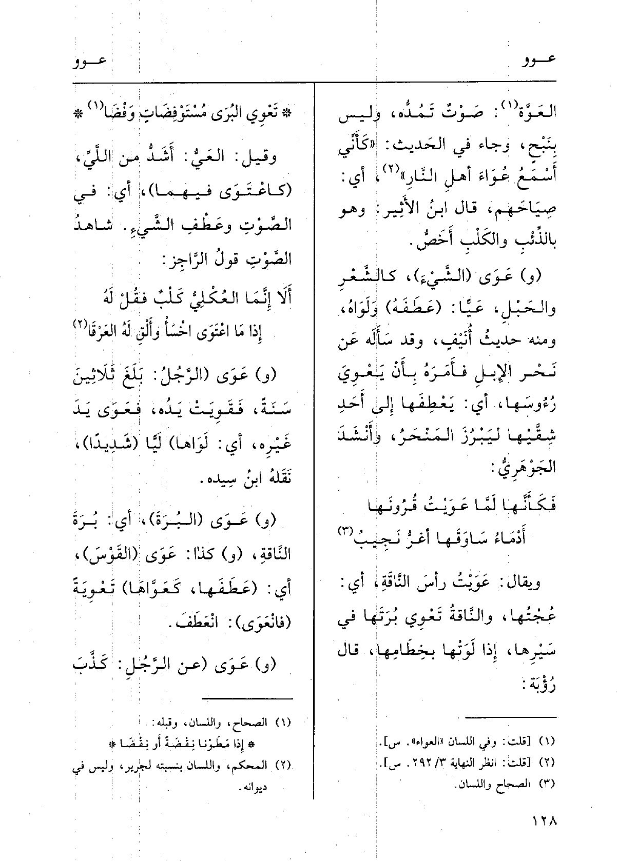 (} كاعْتَوَى فيهمَا) ، أَي فِي الصَّوْتِ وعَطْفِ الشَّيْء، شاهِدُ الصَّوْت قولُ الراجزِ: