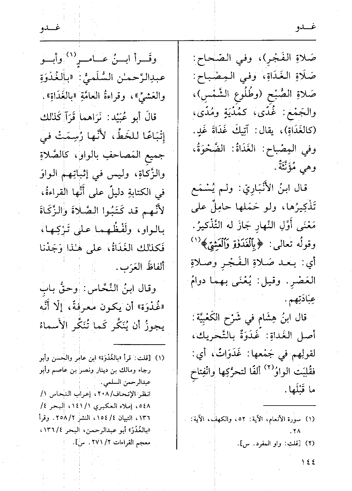 قالَ ابنُ هِشام فِي شَرْح الكَعْبيةِ: أَصْلُ الغُداةِ} غَدَوَة بالتحْريك لقَوْلهم فِي جمعِها {غَدَوَاتٌ؛ أَي فقُلِبَتِ الواوُ ألِفاً لتَحَركِها وانْفِتاح مَا قَبْلها. وقَرَأَ ابنُ عامِرٍ وأَبو عبدِ الرحمنِ السّلمِي {} بالغَدَوةِ والعَشيِّ} ، وقراءَةُ العامَّةِ {! بالغَداةِ} ، قالَ أَبو عبيدٍ: نَراهُما قَرآ كذلكَ إتباعاً للخطِّ لأنَّها رُسِمَتْ فِي جميعِ المَصاحِف بالواوِ كالصَّلاةِ والزَّكاةِ وليسَ فِي إثباتِهم الْوَاو فِي الكِتابَةِ دَليلٌ على أنَّها القِراءَةُ، لأنَّهم قد كَتَبُوا الصَّلاةَ والزَّكاةَ بالواوِ ولَفْظَهما على تَرْكِها، فكَذلكَ الغَدَاةَ على هَذَا وَجَدْنا أَلْفاظَ العَرَبِ.