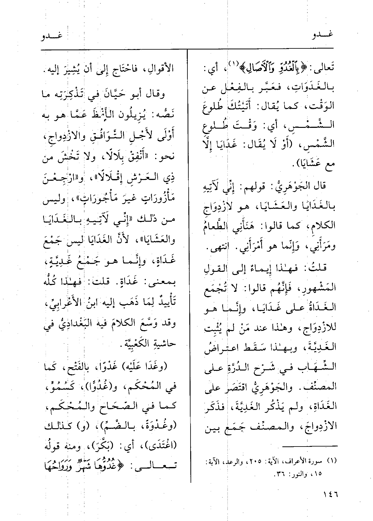 قُلْت: فَهَذَا إيماءٌ إِلَى القوْلِ المَشْهورِ فإنَّهم قَالُوا لَا تُجْمَعُ الغَداةُ على غَدايا، وإنَّما هُوَ للازْدِواجِ، وَهَذَا عنْدَ مَنْ لم يُثْبِت {الغَدِيَّة، وَبِهَذَا سَقَطَ اعْتِراضُ الشَّهاب فِي شرْح الدَّرَّةِ على المصنِّفِ؛ والجوْهرِي اقْتَصَرَ على الغداةِ وَلم يَذْكُر الغَدِيَّة فذَكَرَ الازْدِواجَ، والمصنِّفُ جَمَعَ بينَ الأقوالِ فاحْتاجَ إِلَى أَن يُشيرَ إِلَيْهِ. وقالَ أَبُو حيَّان فِي تَذْكرتِه مَا نَصّه: يزيلون اللّفْظَ عمَّا هُوَ بِهِ أَوْلى لأجْلِ التّوافقِ والازْدِواجِ نحْو: (أَنْفِق بِلَالًا) ، وَلَا تَخْشَ من ذِي العَرْشِ إقْلالاً، وارْجَعَنَّ مأْزُورَات غَيْر مأْجُورَات، وليسَ من ذَلِك إنِّي لآتِيه بالغَدَايا والعَشَايا، لأنَّ الغَدَايا ليسَ جَمْع غَدَاةٍ وإنَّما هُوَ جَمْعُ} غَدِيَّة بمعْنَى {غَدَاةٍ.