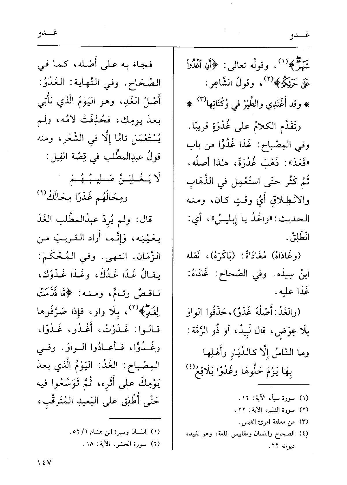 وَفِي النَّهايَةِ: {الغَدْوُ أَصْلُ} الغَدِ، وَهُوَ اليَوْمُ الَّذِي يأْتِي بعْدَ يَوْمِك، فحذِفَتْ لامُه وَلم يُسْتَعْملْ تامًّا إلاَّ فِي الشِّعْرِ؛ وَمِنْه قولُ عبدِ المطَّلبِ فِي قصَّةِ الفِيل: