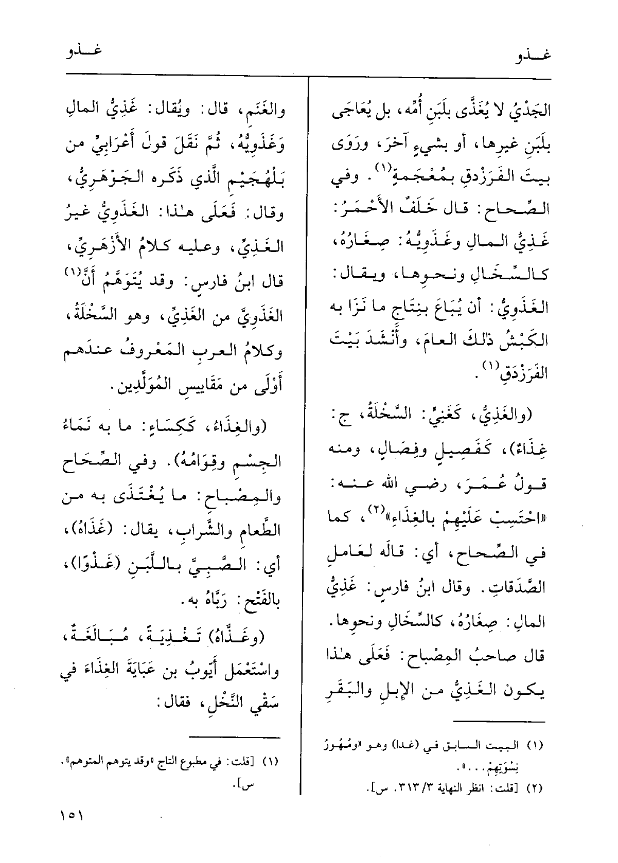 قالَ صاحِبُ المِصْباح: فعلى هَذَا يكونُ الغَذِيُّ مِن الإبِلِ والبَقَرِ والغَنَمِ؛ قالَ: ويقالُ: غَذِيُّ المالِ {وغَذَوِيُّه، ثمَّ نَقَلَ قولَ أَعْرابيَ مِن بَلْهُجَيم الَّذِي ذَكَرَه الجَوْهري، وقالَ: فعلى هَذَا الغَذَوِيُّ غَيْر} الغَذِيِّ، وَعَلِيهِ كَلام الأزْهرِي.