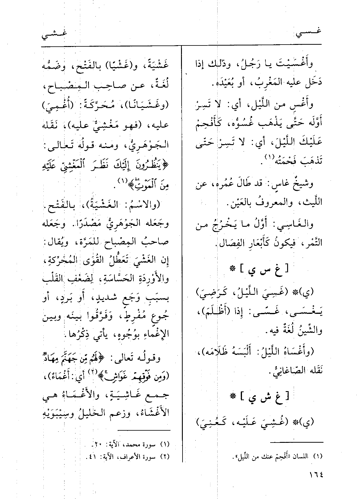 : (ي (} غَسِيَ اللّيْلُ، كرَضِيَ) ، {يَغْسَى} غَسًى: إِذا (أَظْلَمَ) ، والشِّيْن لُغَةٌ فِيهِ.