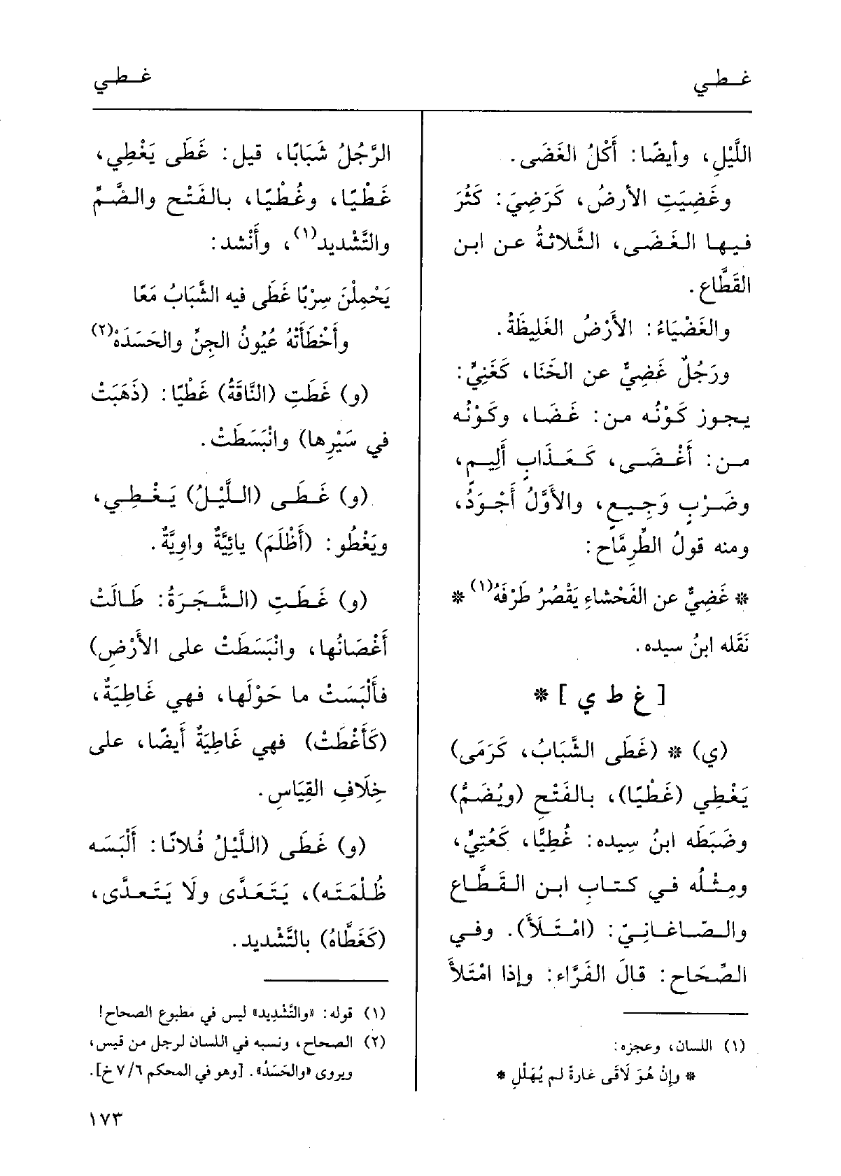 : (ي (} غَطَى الشَّبابُ، كرَمَى) ، يَغْطِي ( {غَطْياً) ، بالفَتْح (ويُضَمُّ) ؛) وضَبَطَه ابنُ سِيدَه} غَطِيًّا، كعُتِيَ، ومِثْلُه فِي كتابِ ابْن القطَّاع والصَّاغاني؛ (امْتَلأَ) . 9