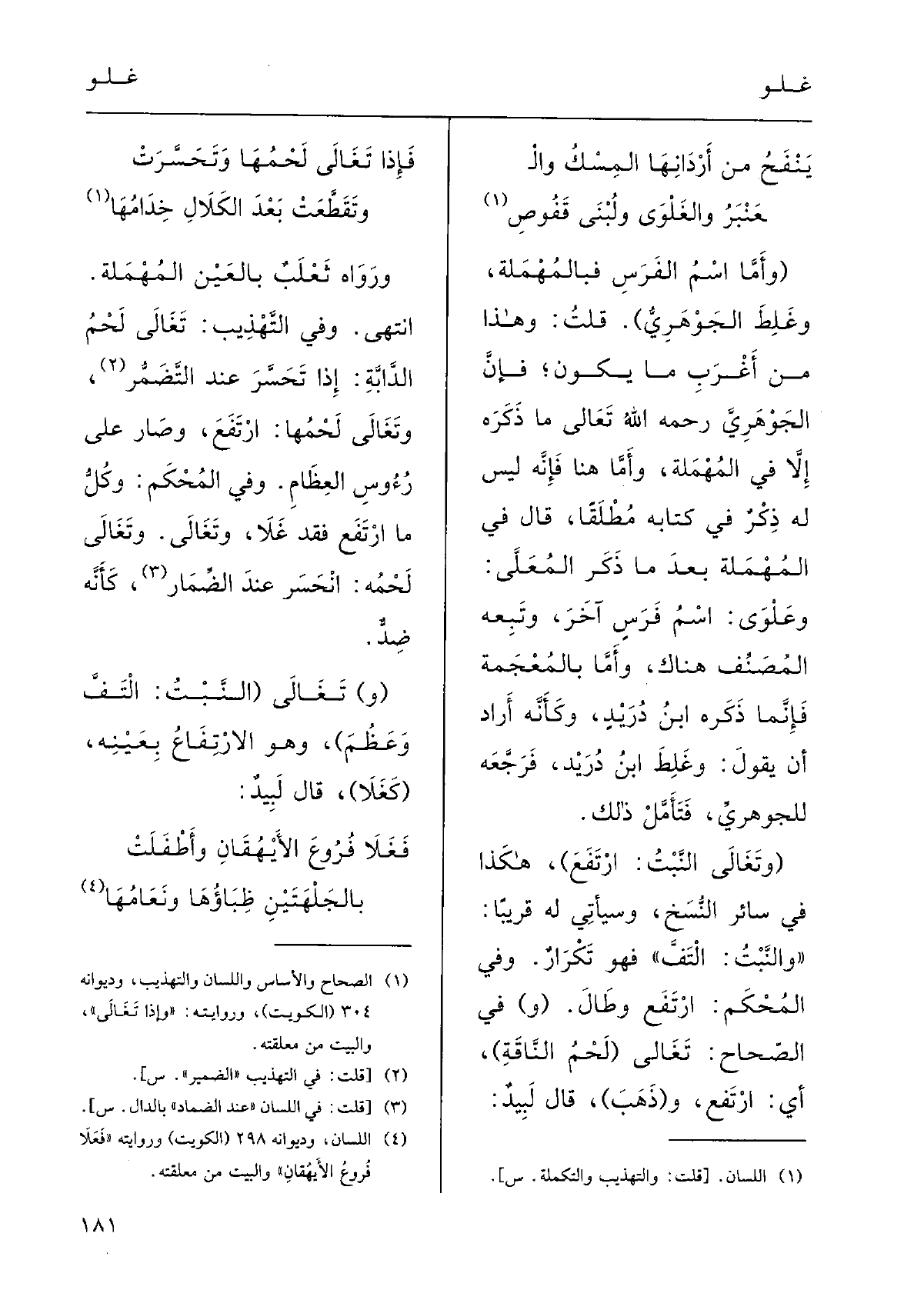 ( {وتَغالَى النَّبْتُ: ارْتَفَعَ) ، هَكَذَا فِي سائِرِ النسخِ وسَيَأْتي لَهُ قرِيباً والنَّبْت الْتَفَّ، فَهُوَ تِكْرارٌ.