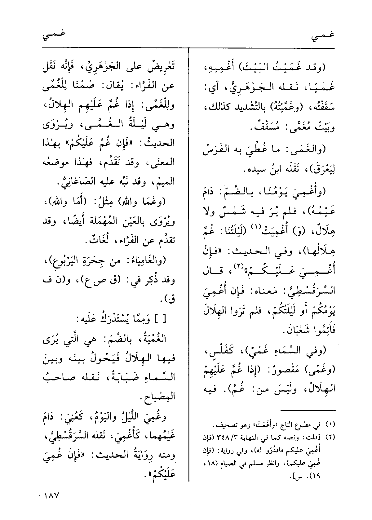 (وَفِي الحديثِ: (فَإِن أُغْمِيَ علَيْكُم) ، قَالَ السَّرقسطي: مَعْناهُ فإنْ {أُغْمِيَ يَوْمُكم أَو لَيْلتُكم فَلم تَروا الهِلالَ فأتِمُّوا شَعْبان.