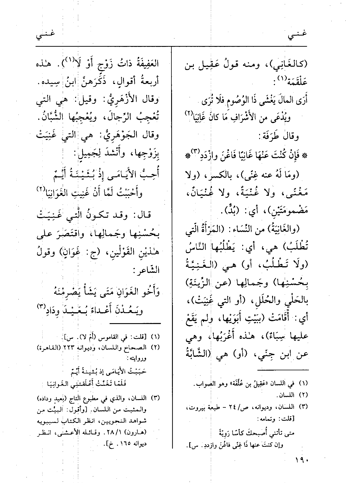 وأَحْبَبْتُ لمَّا أَن غَنِيتِ} الغَوانِيا قالَ: وَقد تكونُ الَّتِي غَنِيَتْ بحُسْنِها وجَمالِها، واقْتَصَرَ على هذَيْن القَوْلَيْن؛ (ج {غَوانٍ) ؛) وقولُ الشَّاعرِ: