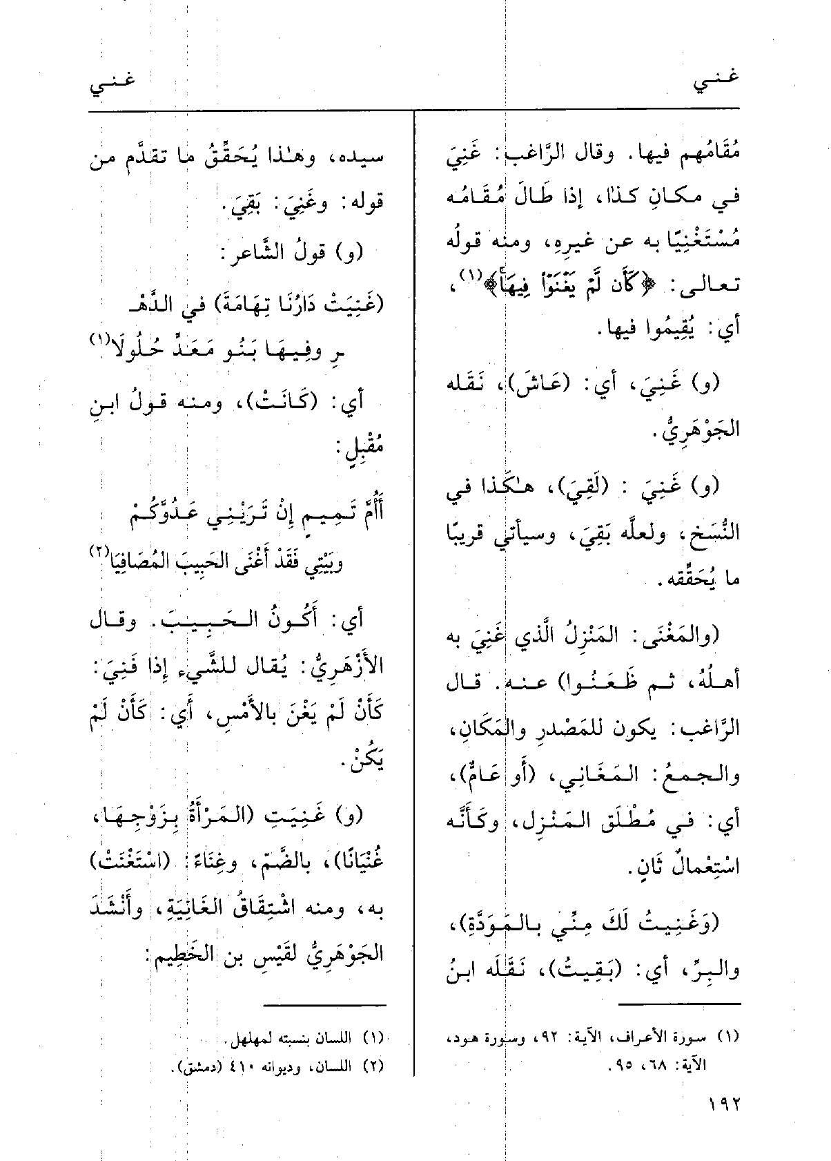 وقالَ الراغبُ: غَنِيَ فِي مَكانِ كَذَا، إِذا طالَ مُقامُه {مُسْتَغْنِياً بِهِ عَن غيرِهِ، وَمِنْه قولُه تَعَالَى: {كأَنْ لم} يَغْنَوْا فِيهَا} ، أَي لم يُقِيموا فِيهَا.