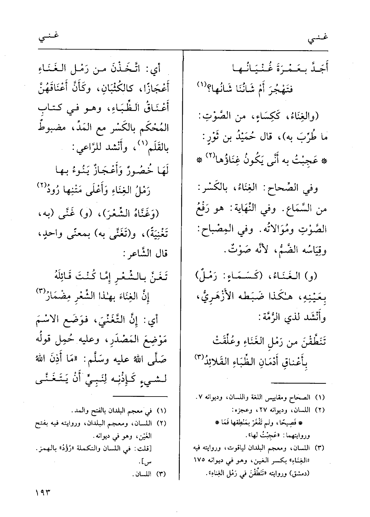 فتَهْجُرَ أَمْ شانُنا شانُها؟ (} والغِناءُ، ككِساءٍ؛ من الصَّوْتِ: مَا طُرِّبَ بِهِ) ؛) قالَ حُمَيْدُ بنُ ثَوْر: