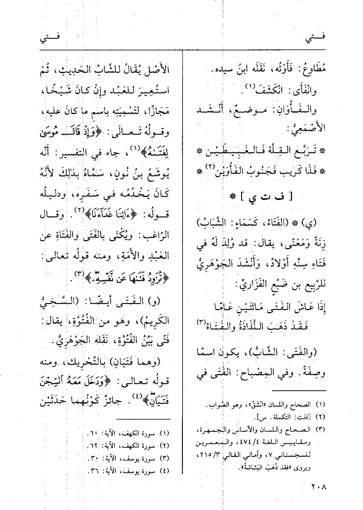 وقالَ الَّراغبُ: ويكنَى {بالفَتَى} والفَتاةِ عَن العَبْدِ والأَمَةِ؛ وَمِنْه قولُه تَعَالَى: {تُراوِدُ {فَتَاها عَن نَفْسِه} .